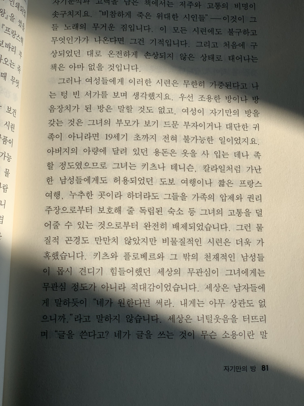 나가기 전 책장에서 고른 책은 <자기만의 방>이었다. 사람 없는 까페의 2층에 앉아 책을 폈다. 마침 해가 사선으로 들었고, 연달아 찬 음료를 마시고 있는 나를 데워주었다. 그럼에도 한기가 들어 머플러를 꺼내 둘렀다. 테이블 정리를 위해 온 직원이 히터를 켜주고 간다. 읽으며 생각했다. 언제 읽어도 새로운 느낌을 준다. 책을 읽고 있는 내가 달라짐에 따라 책 속의 글도 점차 다르게 읽힌다. 무수히 쏟아지는 책들 속에서 살아남은 책이 주는 은총. 고전의 은사.