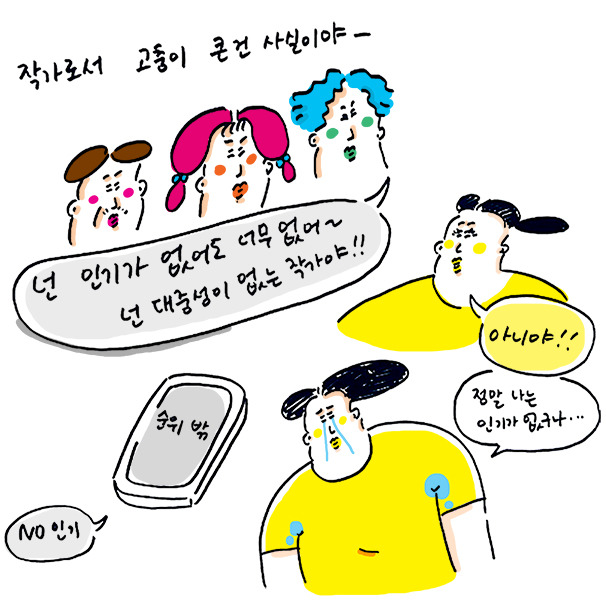 대중적이지 못하다는 평가에 내 20대 초반은 의기소침 그 자체였다. 늘 마음속으로 고민하고 지금도 고민한다. 하지만 이런 내게 힘을 주는 건, 나의 그림을 좋아해주는 사람들이 있기때문이다. 나는 평생 사람들에게 감사해야 한다.
