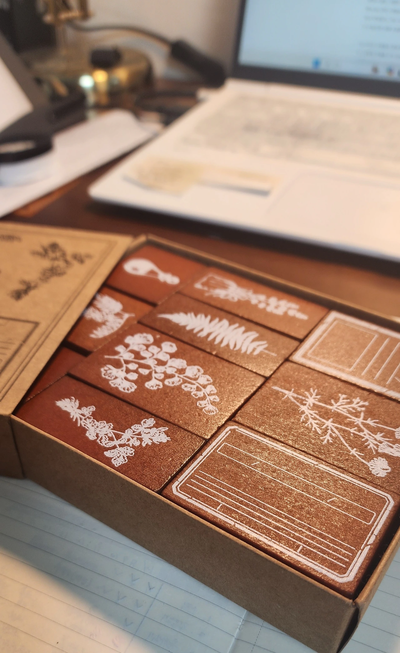알파벳 대문자, 소문자 조각이 고풍스러운 나무 함에 빼곡히 채워진 알파벳 스탬프 한 상자, 꽃과 나뭇잎 문양이 종이 박스에 나란히 꽂혀있는 스탬프, 그리고 아주 그윽한 톤을 내는 갈색과 풀색 잉크를 하나씩 주문했다.