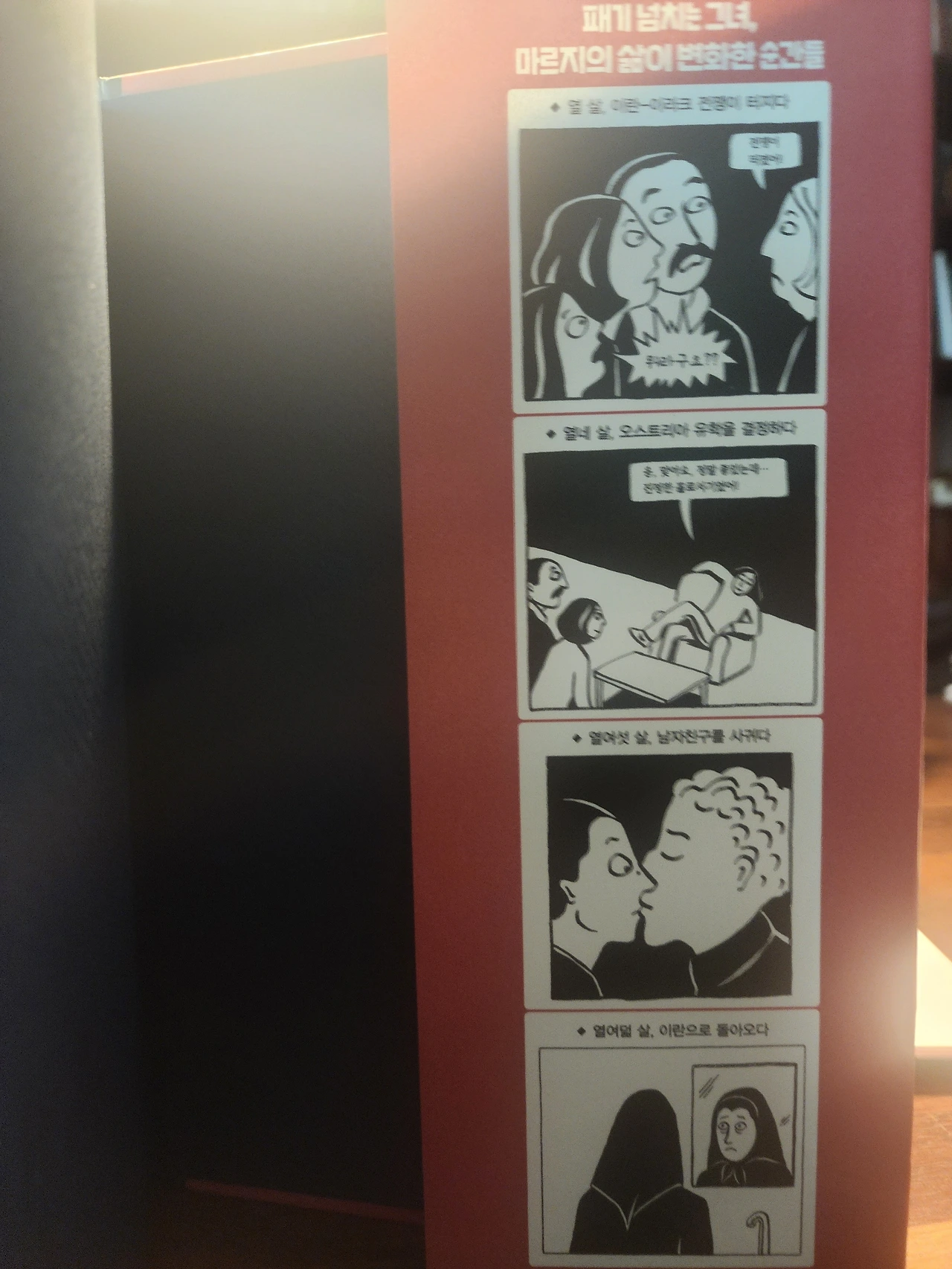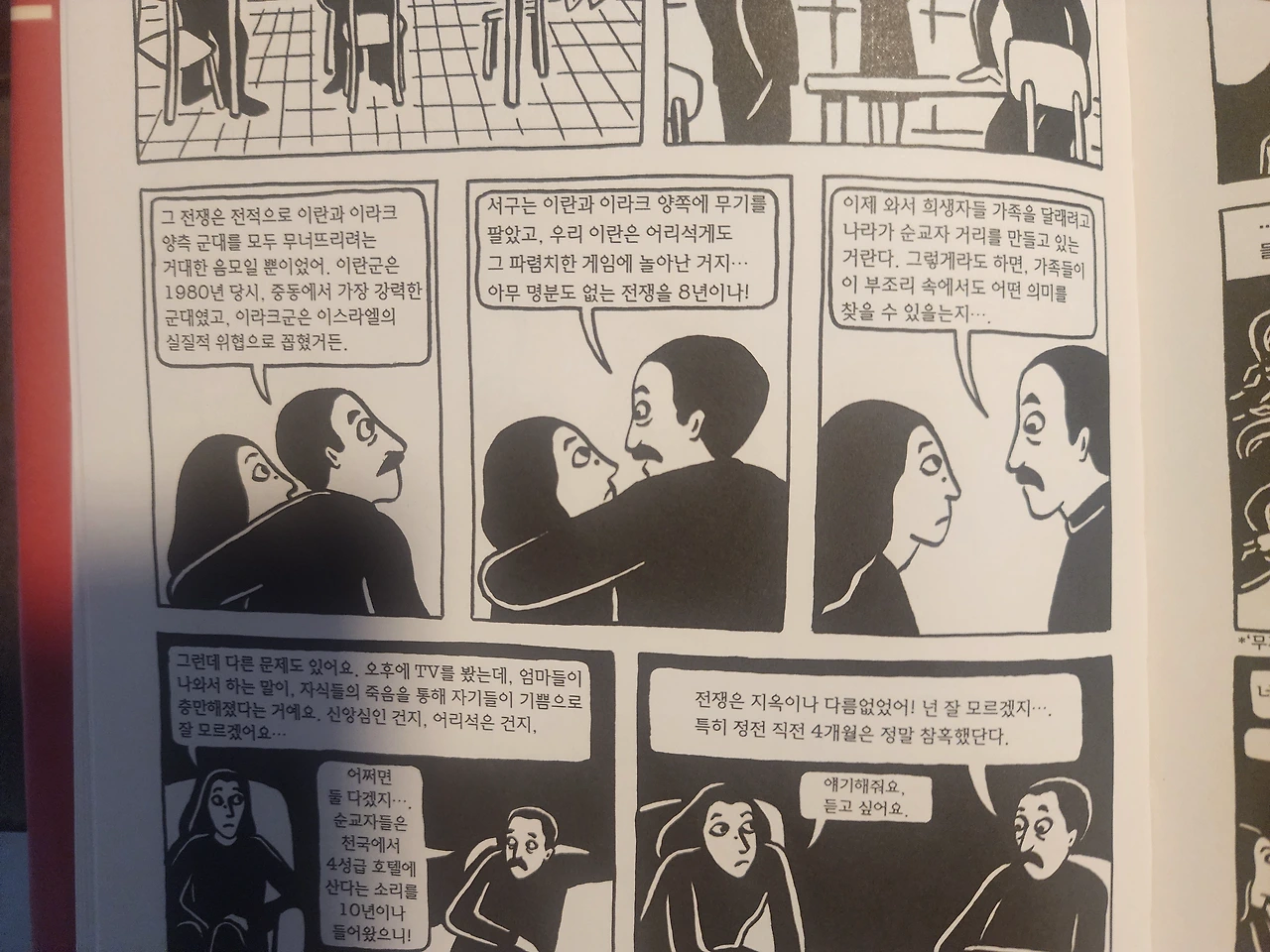 중동의 여인들은 모두가 히잡을 쓰도록 되어있고, 그것은 이곳의 전통이라 태초부터 변함없이 그런 줄로만 알았었다. 만화의 첫 페이지를 보자마자 1980년 이전에는 이란의 여인들이 검은 천을 꼭 싸매고 다니지 않았다는 것을 알 수 있었다. 그들이 문화 혁명이라 불렀던 이란의 혁명 전후 시기에 이 책의 작가 마르잔 사트라피는 10대 소녀였다.