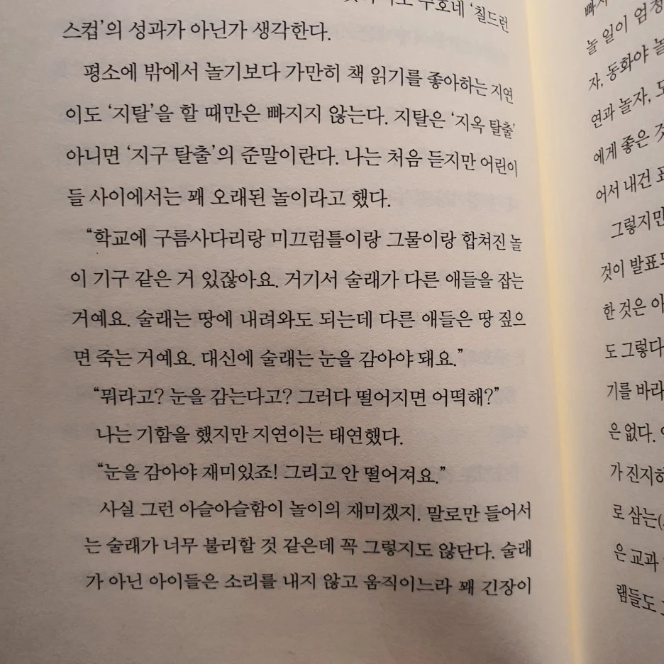 "학교에 구름사다리랑 미끄럼틀이랑 그물이랑 합쳐진 놀이 기구 같은 거 있잖아요. 거기서 술래가 다른 애들을 잡는 거예요. 술래는 땅에 내려와도 되는데 다른 애들은 땅 짚으면 죽는 거예요. 대신에 술래는 눈을 감아야 돼요."