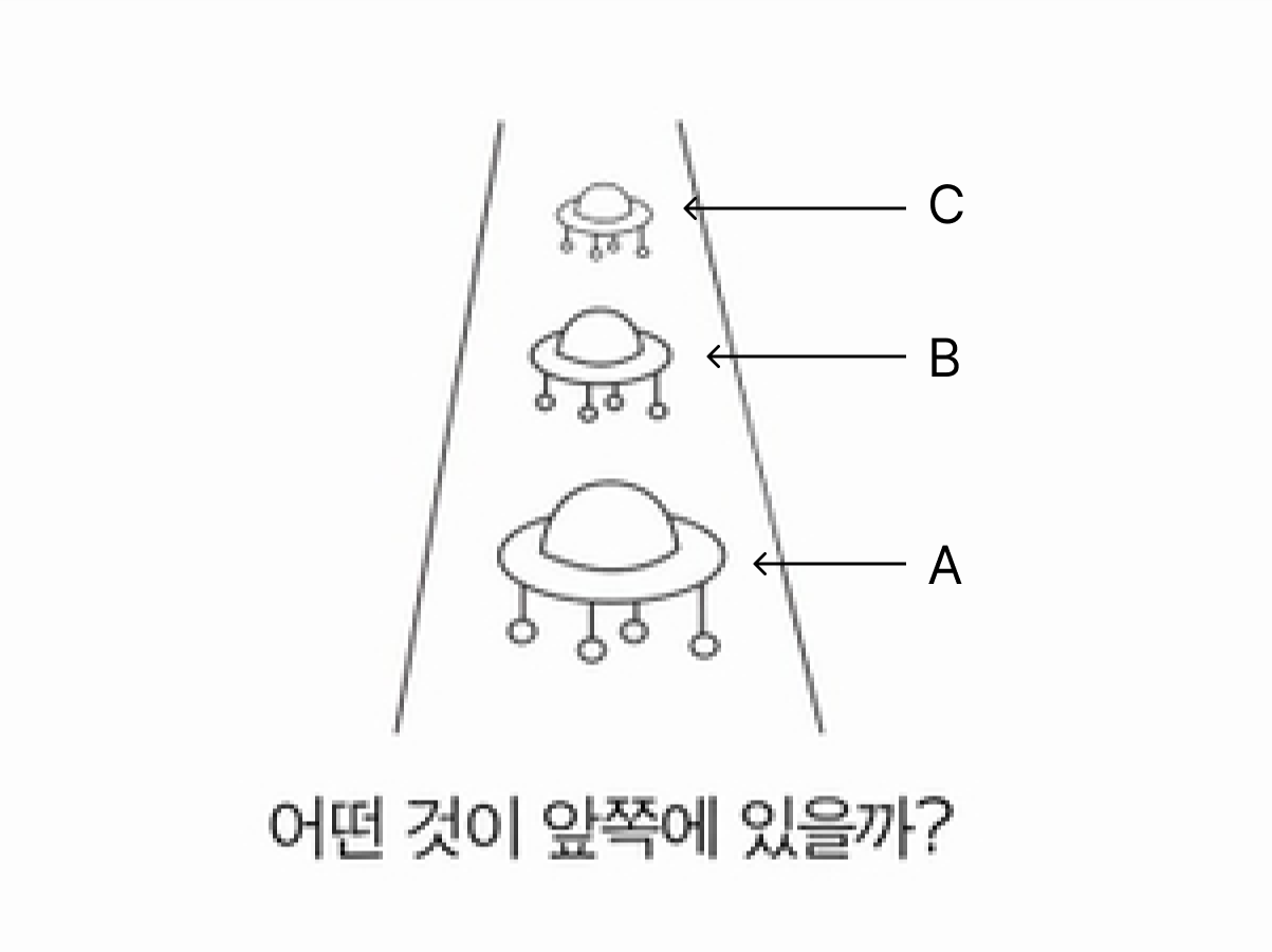 다큐 프라임 동과서의 다큐멘터리에서 아래의 그림에서 A, B, C 중 어떤 UFO가 앞에 있는지를 물었다.