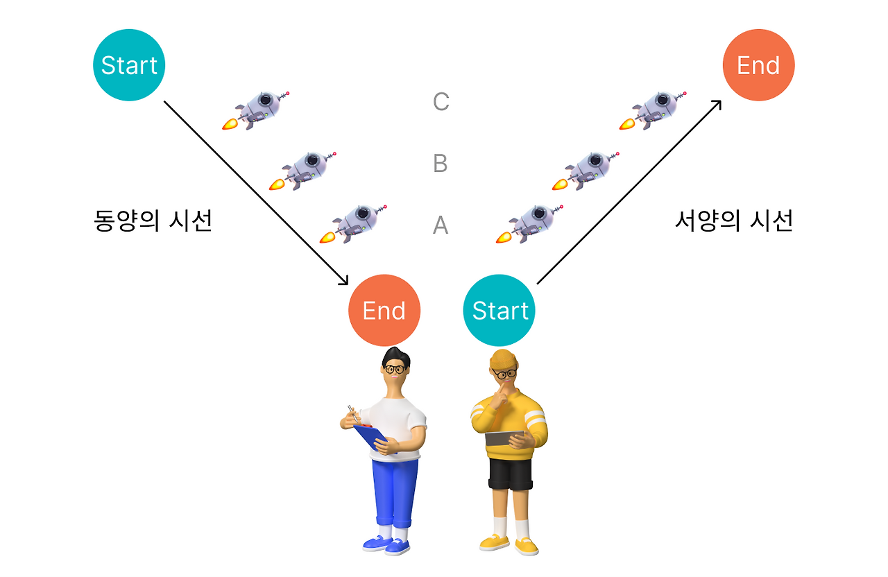 동양에선 상대방의 관점에서 나를 바라보고, 서양에선 자신의 입장에서 대상을 바라본다.