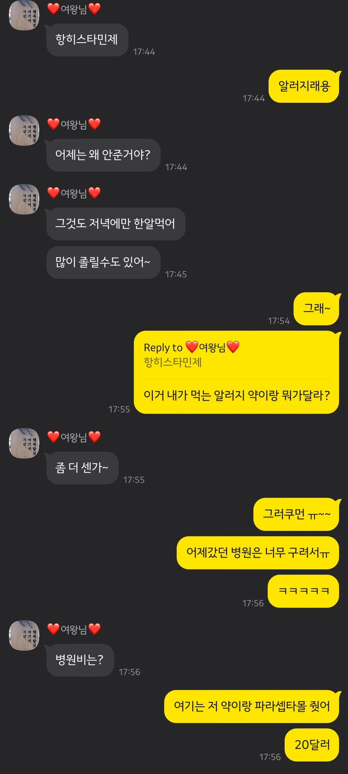 병원에서는 약도 처방해줬다. 솔직히 물가를 따지면 약값 포함해 20달러라는 병원비가 꽤 비싼 편이었지만 마음만은 한결 가벼워졌다. 이제야 걱정과 스트레스를 접어둘 수 있겠더라. 강경하게 병원에 가자던 남자친구에게 고마웠던 순간 중 하나였다. 목요일부터 토요일까지 고작 삼일 간 지독히 심했던 알레르기였지만 다신 겪고 싶지 않은 시간이었다.