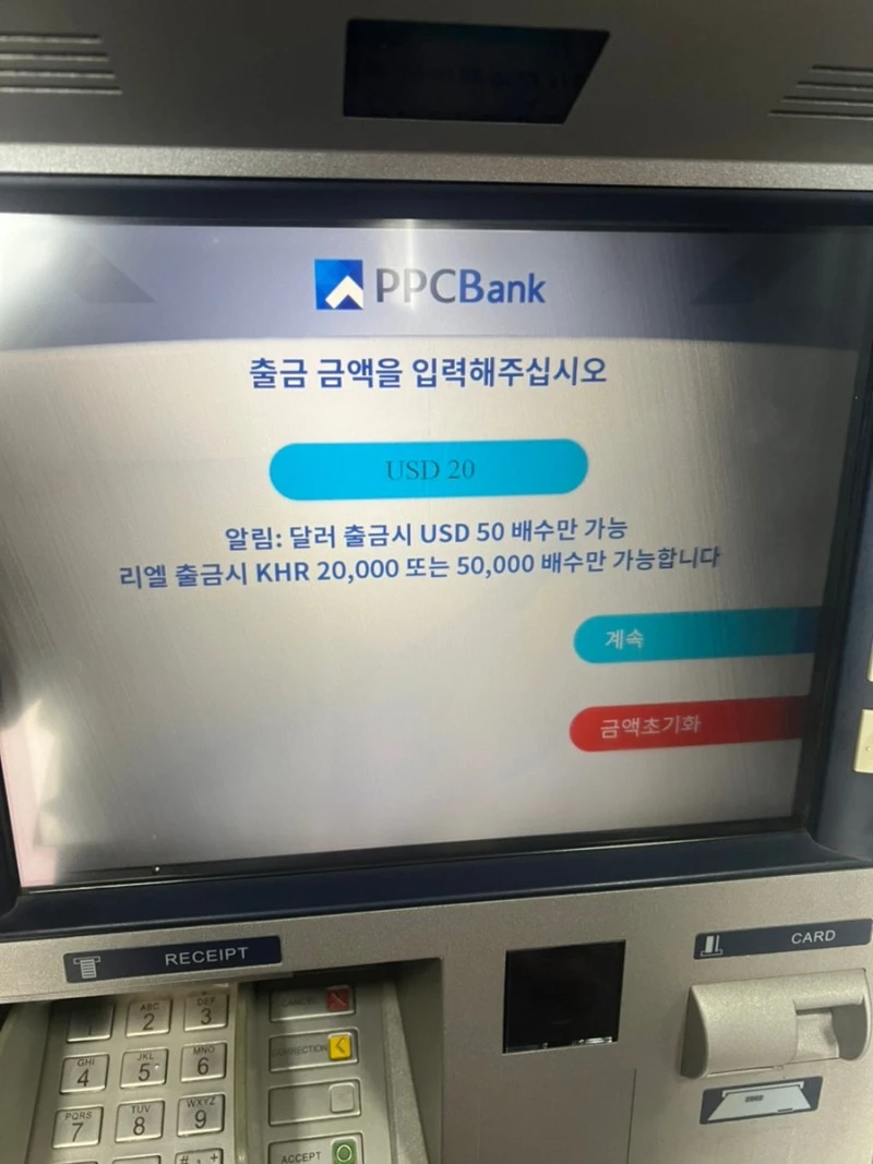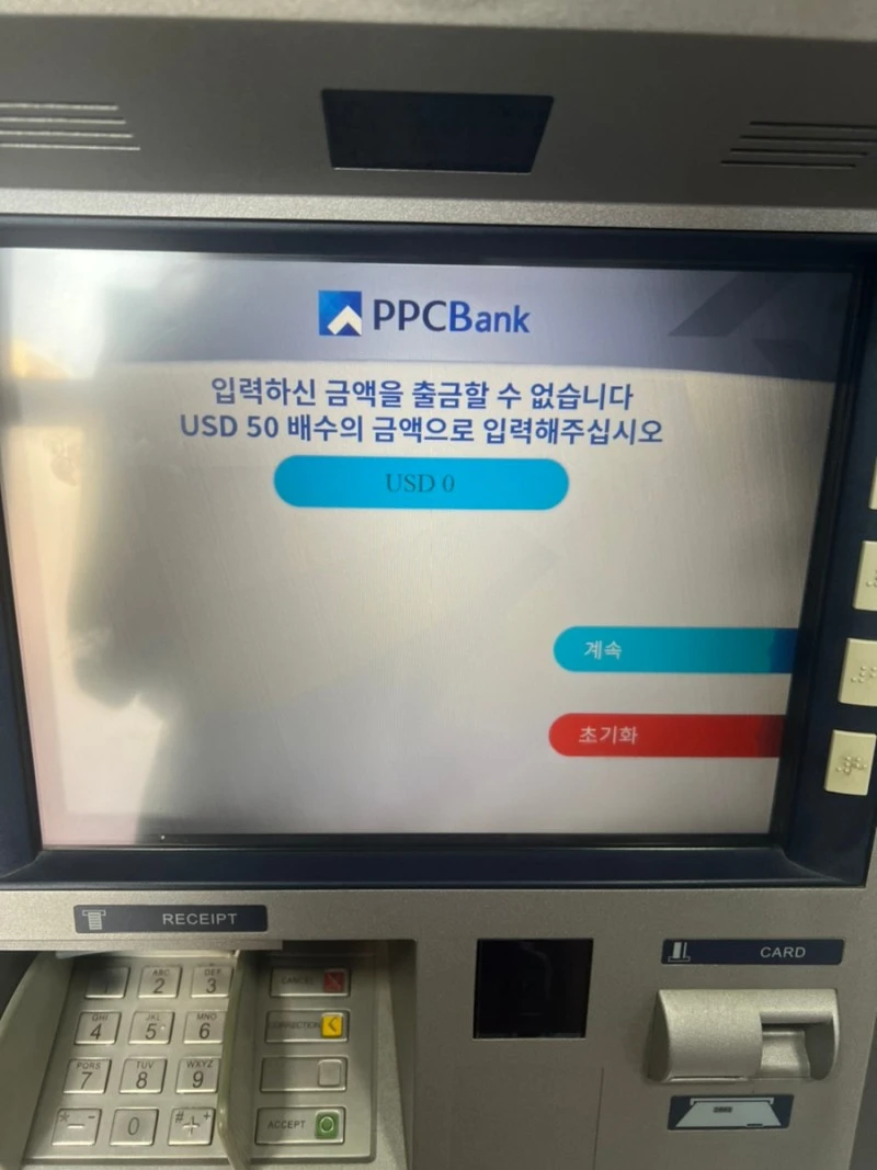 제대로 정보를 찾아보지 않고 무작정 현금인출기를 사용하러 간 거라 출금 수수료가 얼마나 되는지도 몰랐다. 은행에 따라 최소 인출 가능한 현금의 금액도 다 다른가보다. PPC뱅크의 ATM기는 신기하게도 한국어로도 지원이 된다. 다만 달러 출금시 50달러 배수의 금액만 출금이 가능한 것 같았다. 게다가 거래수수료가 5달러라는 것이다. 처음에는 이 은행만 수수료가 이렇게 비싼가 싶어 다른 곳에서 돈을 뽑기로 했다.