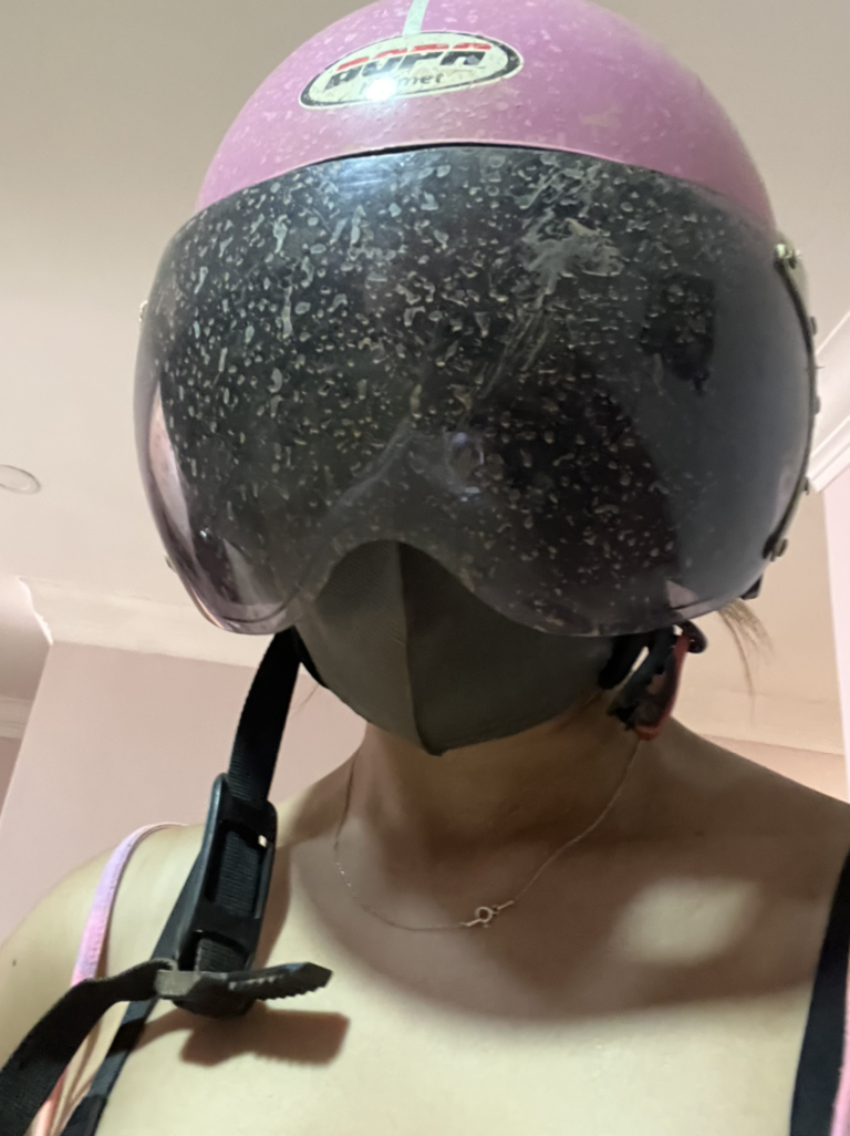트럭이 흩뿌리고 간 먼지가 비 때문에 얼굴이며 몸, 헬멧에 고스란히 달라붙어 얼룩을 만들고 있었다. 둘 다 헬멧을 쓰고 있어 입 주위와 턱 부분만 붉은 흙으로 얼룩진 게 진짜 웃기긴 했다.