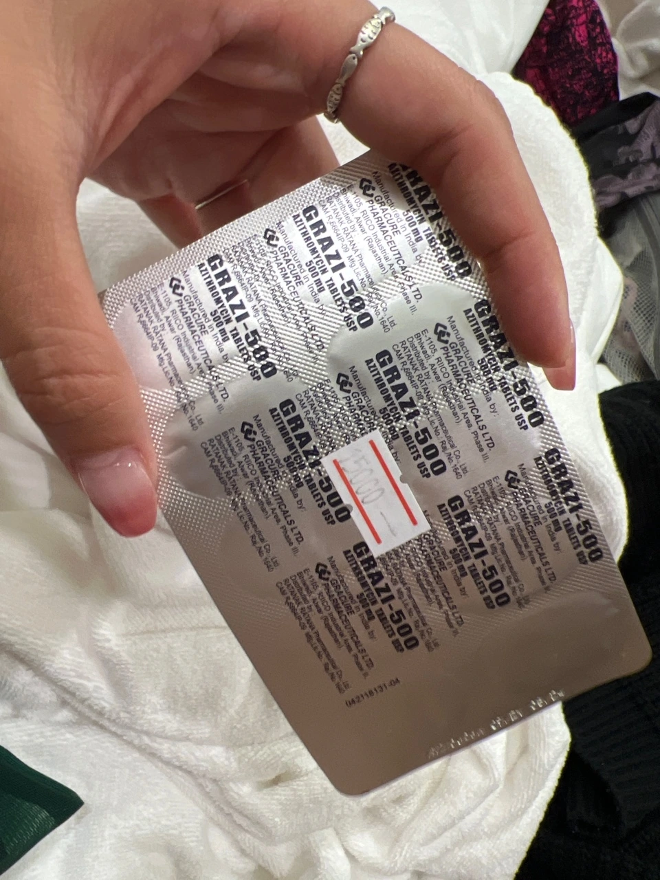 캄보디아에서는 한국처럼 약을 작은 박스에 포장해 팔지 않고 약을 다 낱개로 뜯어준다. 물론 약마다 가격이 다 다르다. 이건 이렇게 알약이 열개 들어있는 한 장(?)이 15000릴이었다. 내게 필요한 건 딱 3알이었지만 나머지는 비상용이라고 생각하기로 했다.