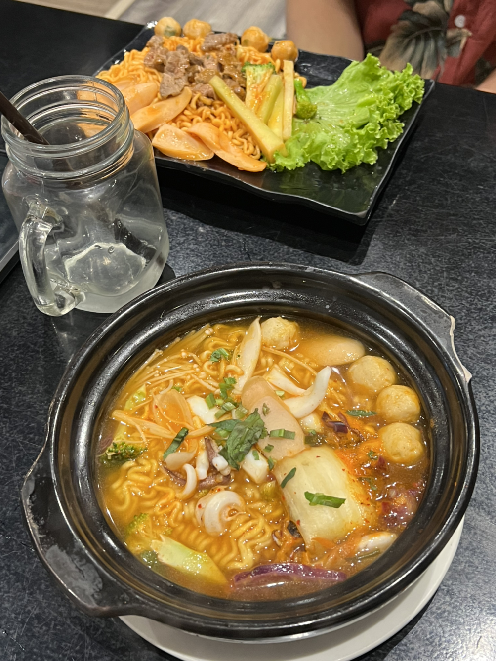 메뉴에는 다양한 종류의 한국식 라면, 볶음 라면, 비빔밥 등이 있었다. 딱 저녁 시간대라 그런지 식당 안은 사람들로 꽉 들어차 있었다. 나랑 A만 외국인인 것 같았는데, 이렇게 많은 현지 사람들이 한국식 라면을 즐겨 먹는다는 사실이 확실히 놀라웠다. 신발을 벗고 올라서야 하는 낮은 테이블 자리를 배정받은 우리는 겨우 자리를 잡고 앉았다. 요즘은 한국에서도 사라져 가는 추세라지만, 이렇게 바닥에 앉아서 먹는 방식이 꽤나 한식당답다.