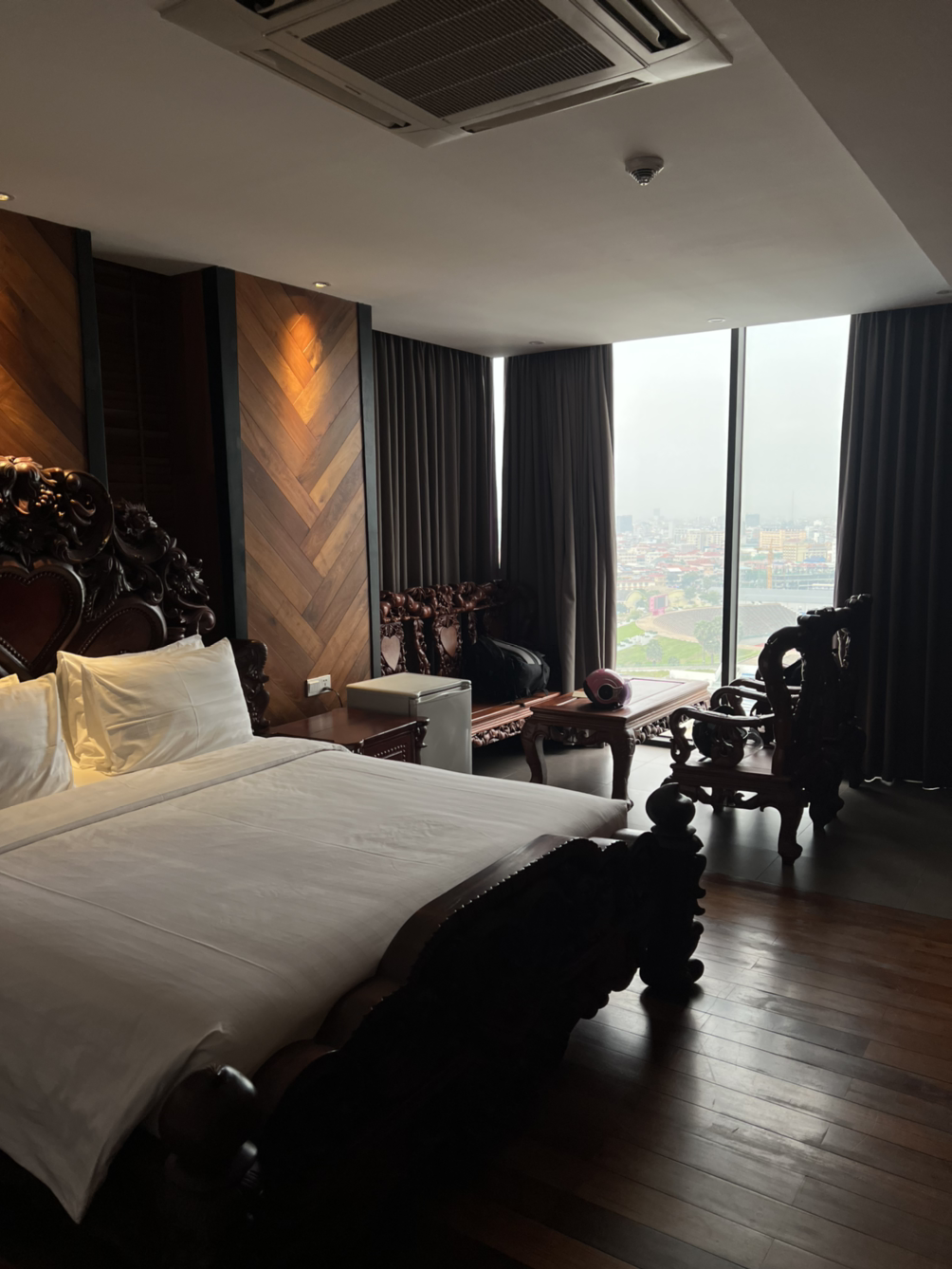 그래도 캄보디아에서의 마지막 며칠이라니까 좋은 숙소에서 묵으며 이 여행을 마무리하기로 했다. 어플을 이용해 열심히 찾다 보니 운 좋게도 4성급 호텔을 엄청나게 저렴한 가격에 예약할 수 있었다. 평소보다 1박에 15달러 정도를 더 주고 예약한 건데 조식이 포함된 가격이라 이틀간 아침 걱정은 안 해도 되니 오히려 좋다. 객실 중에서는 제일 높은 층이라 전망도 좋았고 무엇보다 방이 정말 널찍했는데, 유난히 고풍스러운 가구들 때문에 박물관에 있는 느낌이었다.