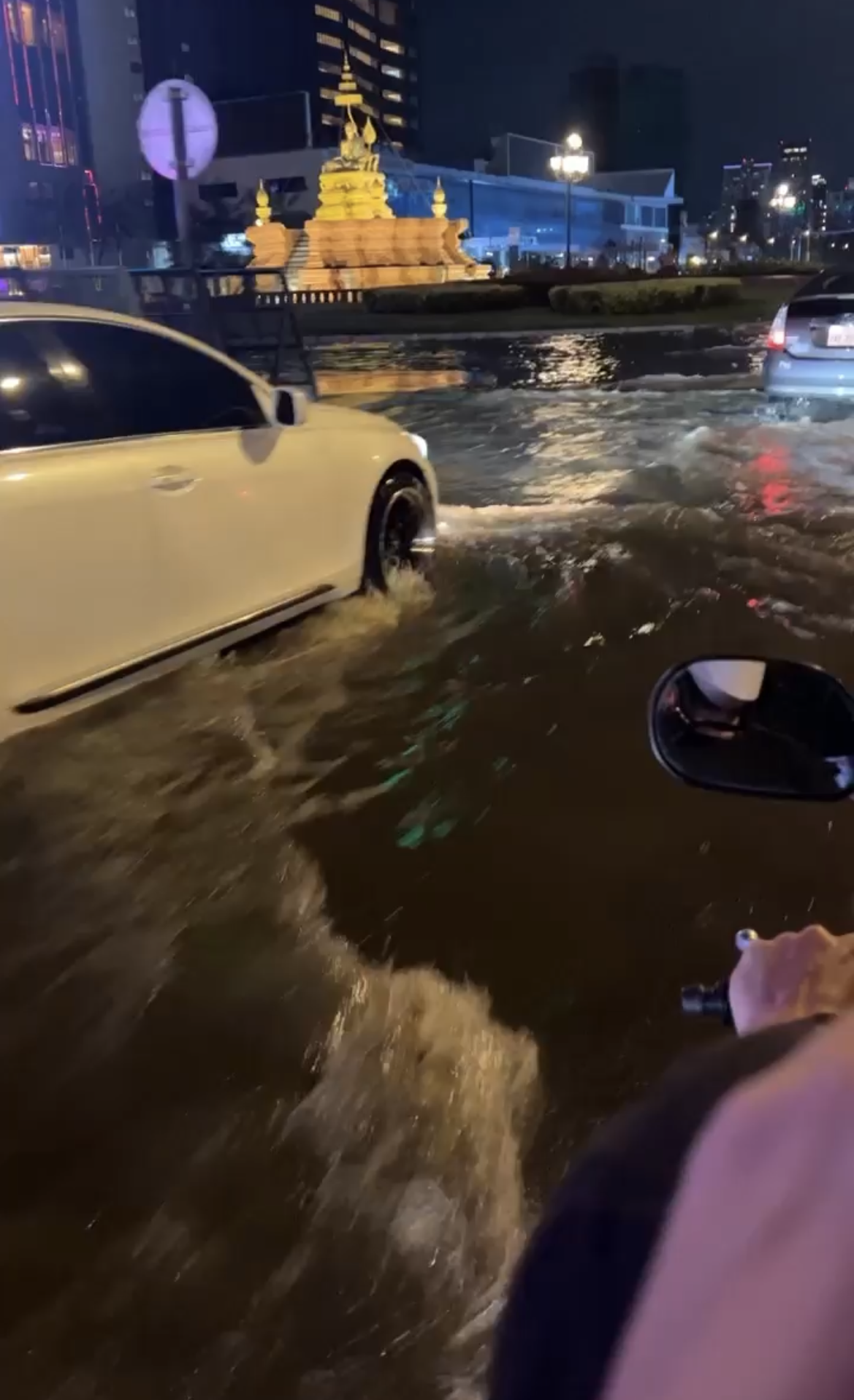 신발이 다 젖을 만큼 들어찬 물을 가르며 야경을 보고 있다는 사실이 너무 재밌어서 계속 웃음이 났다. 우리는 완전 물에 젖은 생쥐꼴인데 캄보디아 사람들은 정말 아무렇지 않게 도로를 누볐다. 뭐가 그렇게 웃겼는지 우리는 빗속에서 드라이브를 하는 내내 웃음을 멈추지 못했었다. 도시의 반짝거리는 조명이 찰랑거리는 도로 위로 춤추듯 반사되고 있었다.