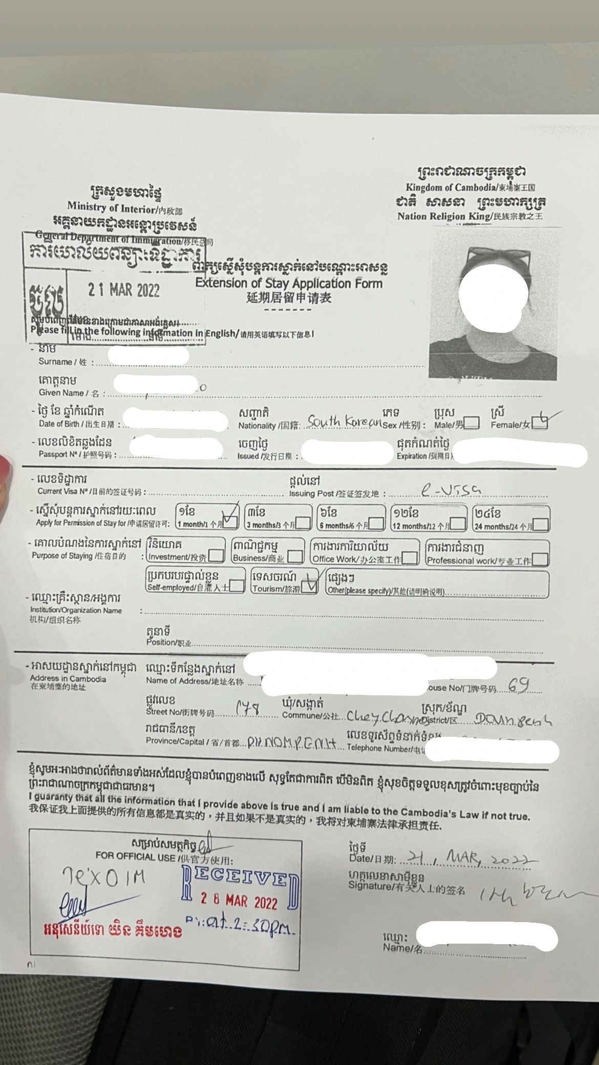 해당 건물 안에서는 사진 촬영이 금지되어 있어 내부 사진은 찍지 못했지만 우리가 작성했던 서류는 찍을 수 있었다. 무엇 때문에 왔냐는 질문에 관광비자를 연장하고 싶다고 말하니 먼저 서류를 작성하라며 경찰관이 이날 날짜 도장이 찍혀있는 종이를 우리에게 건네주었다.
