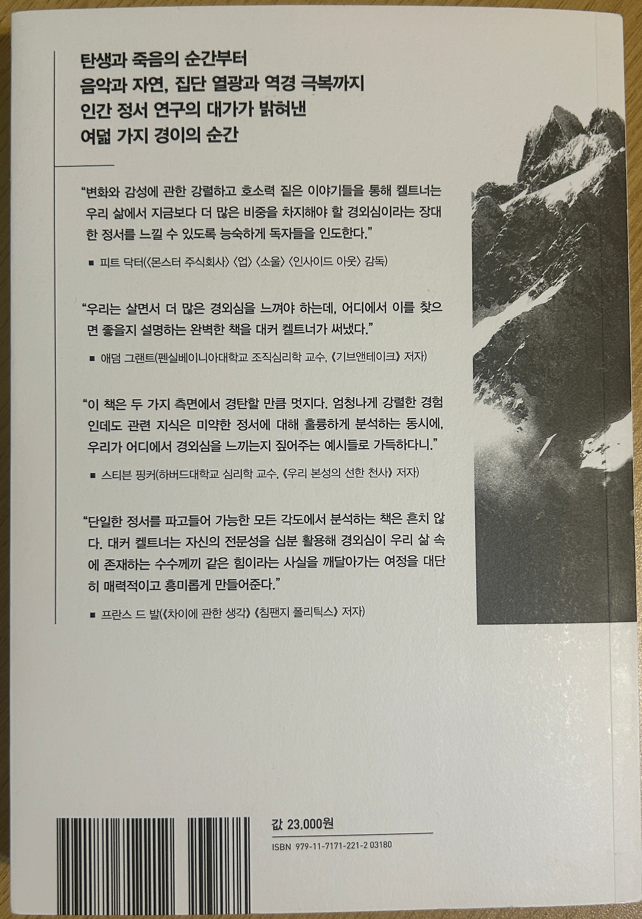 기껏 골라왔을 사진을 90도 돌려 옆에 세웠다. 그것도 흑백이라서 배경색과 구름이 구분안되는 이상하고 폼 안나는 구성이다. 결과적으로 표지 절반이 허연 공백이다. 혹시 내가 간과한 뭔가 있을까 싶어 유심히 봤지만 그런건 없다. 그저 못 만든 표지일 뿐이다. 그런데 웃기게도 뒷표지는 꽤 괜찮다. 앞에 쓴 사진의 다른 부분이 쓰였는데, 나름 괜찮아 보인다. 뒷표지만 보면 웅장한 산 사진이 표지의 앞에서 뒤로 연결되어 있을것 같은데, 앞 표지는 생뚱맞다. 누가 이 표지를 보고 경외심을 떠올릴까?