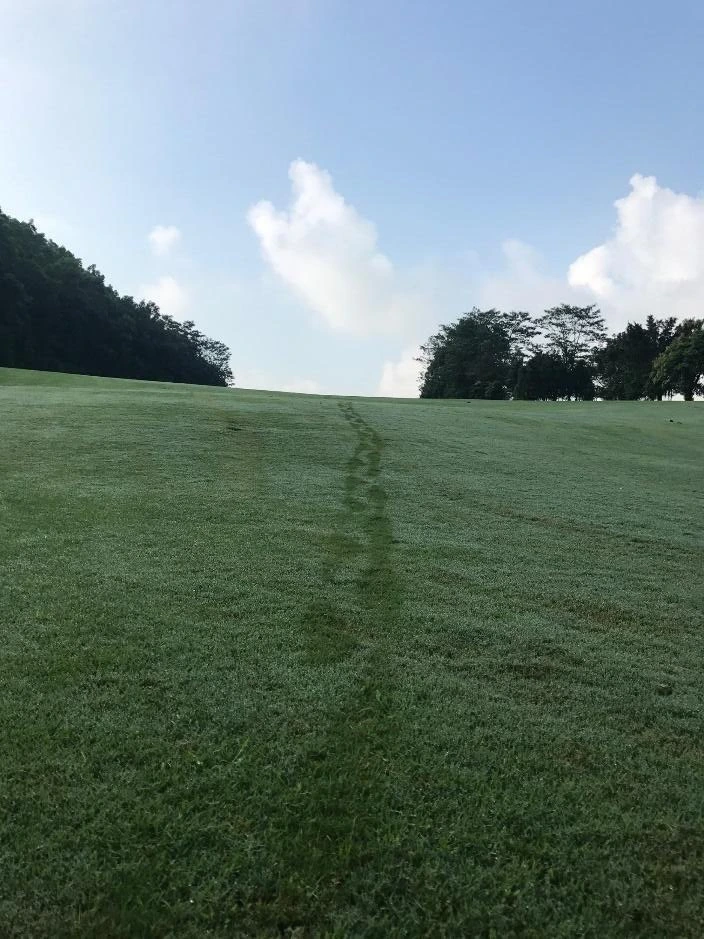 걷다 보니 나보다 먼저 아침 이슬을 밟고 간 발자국이 보입니다. 캐디인 것 같습니다. 발을 질질 끌고 간 모습에서 즐거움이나 경쾌함이 느껴지지 않기 때문입니다. 이제는 1인당 GDP가 7,000불을 넘는 개발도상국이 된 이 나라에서 매 라운드가 끝나면 그들이 받는 캐디 팁 100위안의 크기가 예전만큼 크지는 않으리라 짐작됩니다. 또래들과의 수다가 좋고 외모 가꾸기가 좋을 나이에 촌스러운 빨간 츄리닝과 커다란 안전모를 쓰고 땡볕에 온종일 남의 시중을 들어야 하는 이 일이 얼마나 힘들까 싶습니다.