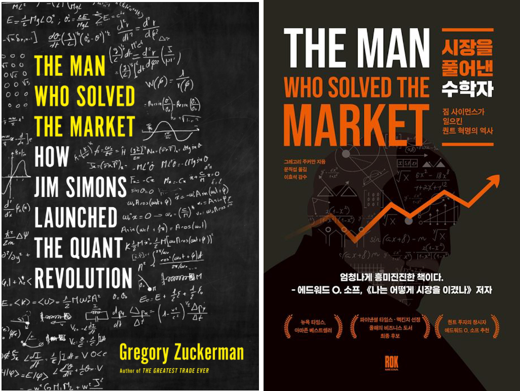 영문본과 한글본 표지가 비슷하지만 한글본이 훨씬 깔끔하고 좋다고 생각된다. 영어본 표지는 금융시장을 통달한 천재 이미지가 너무 강하다. 그 천재는 머리속에 가득한 남들이 이해못할 비밀의 수학으로 당당하게 시장과 대결한다. 시장과 싸워 이기는 천재 이미지가 오만해보인다. 반면, 한글본 표지에 있는 사람은 고민하는 사람이다. 물론 그도 수학자이고 천재겠지만, 이 사람은 시장을 이해하고 분석하기 위해 고민한다. 실제로 시장을 대하는 일은 누구에게나 어렵고, 거의 모두가 실패하는 와중에 극히 소수만 성공과 실패를 반복하면서 승률을 높여간다. 짐 사이먼스가 그랬듯이. 검은 바탕의 흰색과 오렌지 색을 섞어 쓴 것도 "수학자"와 "the Man"이라는 키워드를 돋보이게 한다. 다시 봐도 한글본 표지가 깔끔하다. 영문본보다 10배는 잘 만든 표지다.