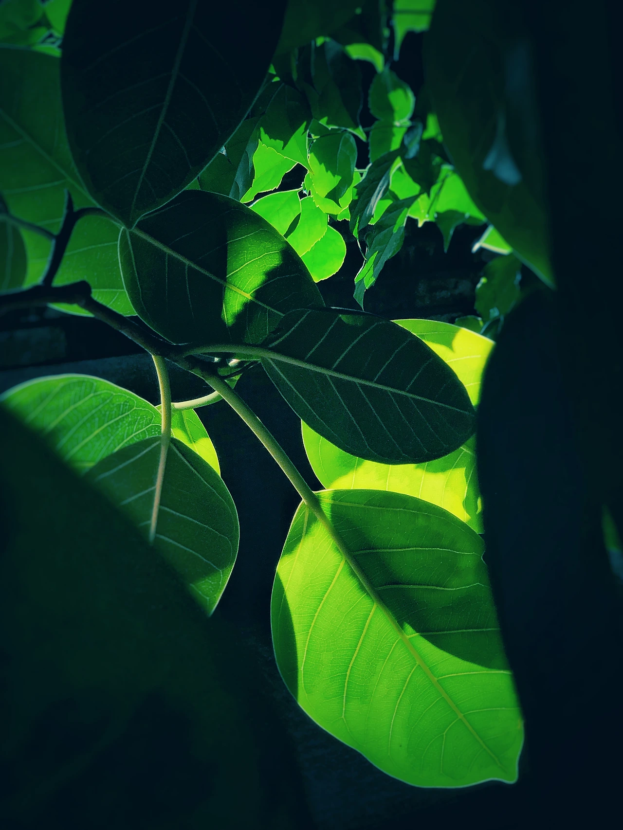 어느 식물의 넓은 나뭇잎에 햇살이 앉는다.