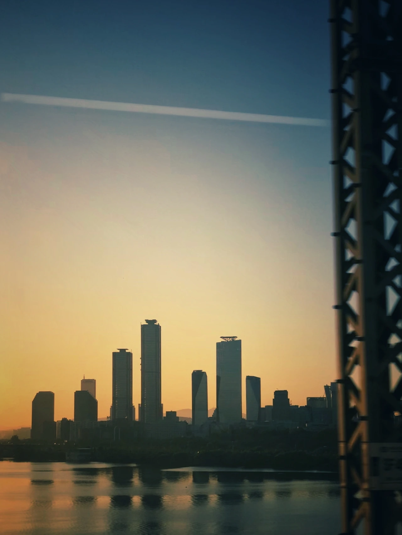 창밖 멀리의 건물과 하늘을 수놓는 비행운에,