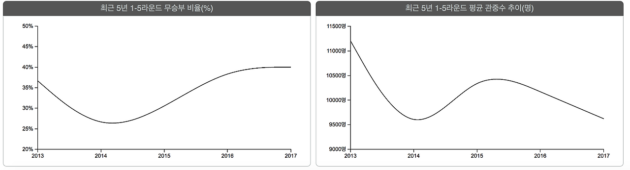 최근 5년 동안의 K리그 1-5라운드에서의 경기들을 살펴봤다. 실제로 2015년 이후로 무승부인 경기 비율이 상승하고 있는 추세였다. 하나 더 주목할 만한 점은 홈팀 승률이 2014년 이후로 최저라는 점이다. 무승부의 비율이 올라갔고, 그나마 승부가 나는 경기에서도 홈팀이 이기는 경기가 적어지고 있다는 뜻이다. 관중수 추이에서 볼 수 있듯이 경기당 평균 관중수 추이는 계속해서 떨어지고 있다. 평균이라는 관점에서 봤을 때 1000명이 감소했다는 것은 꽤 큰 숫자이다. 경기장에 직관을 가본 사람이라면 알겠지만 1000명이라는 숫자가 어떤 의미인지 쉽게 알 수 있을 것이다. 게다가, 관중 수가 상대적으로 많은 전북 현대, FC서울의 관중 수를 제외하면 평균 관중수는 급락한다. 직접적인 인과관계를 설정할 수는 없지만, 무승부 경기가 자주 나오는 것은 팬들 입장에서는 재미라는 측면에서 좋지 않을 수 있다.