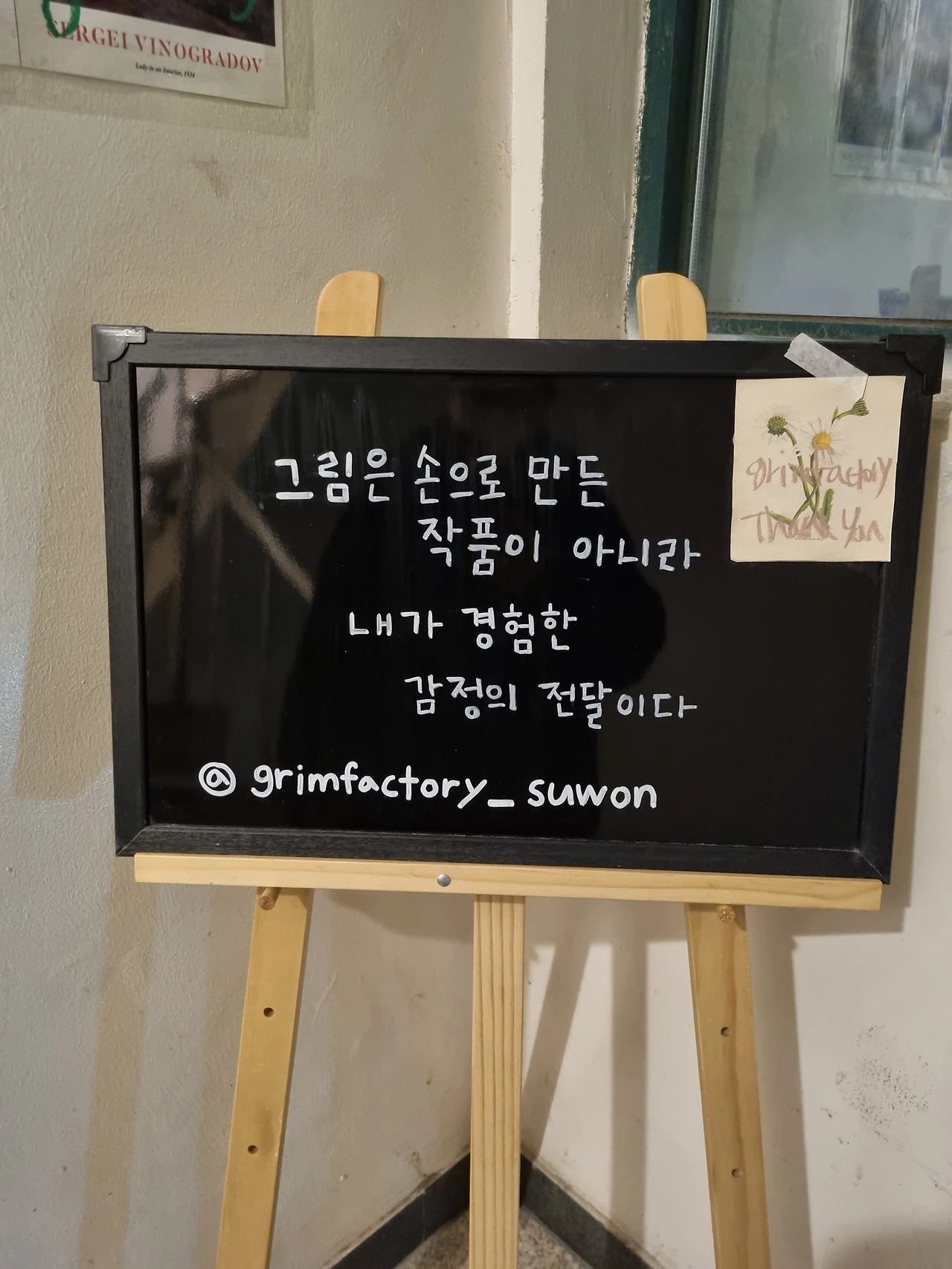 2층 카페로 올라가는 길에 있는 문구인데, 엄청 공감됐다. 난 초등학교 때 미술시간에 학교에서 구비해준 물감을 풍성하게 사용하면서(낭비하면서) 미술에 재미를 붙였는데, 나이 먹고 내 돈 주고 물감 사려니 가격이 부담되는 데다가 입시미술을 잠시 하면서 내가 데생에 재능이 없다는 걸 깨닫고(데생만 그랬을까?ㅎ) 흥미만 남기고 손대지 않는 추억 속 취미생활쯤으로 전락한 미술 취향을 가지고 있었다.