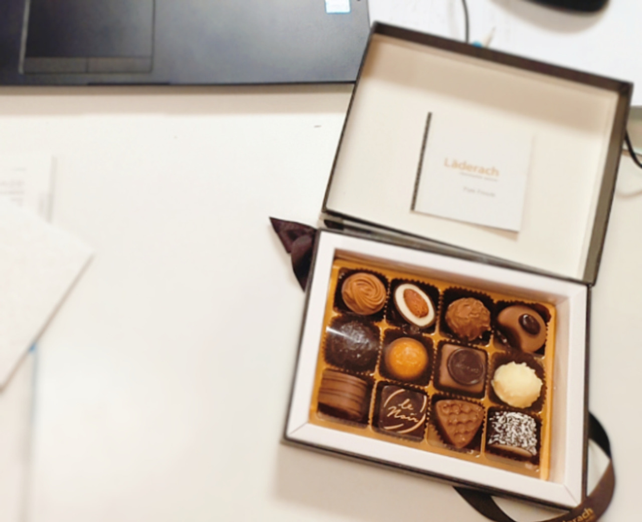내 책상 위에는 항상 초콜릿이 놓여있다. 당장 시선을 왼쪽으로 향하면 여직 리본을 감싸고 있는 레더라 봉봉 쇼콜라(Bonbon Au Chocolat) 박스가 눈에 띈다.