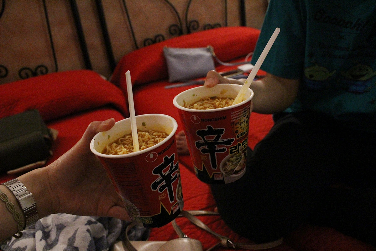 숙소에 돌아와서 라면을 먹으려는데 호스텔엔 커피포트도, 조리 시설도 없었다. 영어를 못하는 프론트 아저씨여서 우리는 손 짓 발 짓, 그림으로 대화를 했지만 여기 호스텔엔 없는 걸로 판결이 났다. 대신 여기를 가면 뜨거운 물을 얻을 수 있다며 어느 가게 이름을 적어주셨다. 적어주신 곳은 밤 늦게까지 하는 타파스집.. 차마 뜨거운 물만 받으러 들어갈 수도 없고ㅠㅠ 무엇보다 창피해서 우리 둘은 문 앞에서 망설였다. 상황이 너무 웃기고 어이없어서 계속 길바닥에 앉아 웃었다. 하지만 결국 용기를 내서 들어갔고, 우리는 뭐라도 사려고했지만 직원은 돈을 받지 않고 온수를 내어줬다. 고마움과 쪽팔림을 인사로 때우고 돌아와서 맛있게 신라면을 먹었다 ㅋㅋㅋㅋㅋ 생에 제일 웃기고 사연있는 라면이었다. 평생 못 잊을 듯.. 다 먹고 내일 일정 정리하고 씻고 잘 준비를 했다. 늦게 씻어서 머리를 말리느라 새벽 3시가 넘어서야 잠에 들었다. 하루하루가 역동적이다.