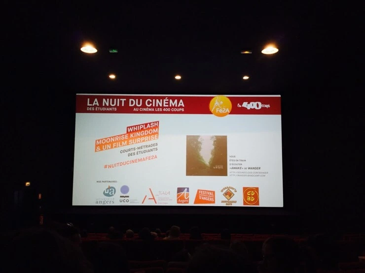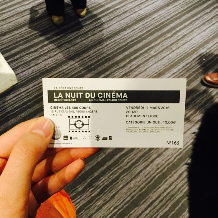 3월 11일인 오늘은 '영화의 밤(La nuit du cinéma)'라는 행사가 있는 날이다. 앙제에 있는 가장 큰 영화관 중 하나인 'Les 400 coups'에 가서 티켓을 샀다. 자그마치 오후 8시 30분 부터 새벽 4시 30분까지 세 편의 영화를 연속으로 틀어준다. 10유로를 내면 팝콘, 음료 및 빵들을 무제한으로 먹을 수 있다.