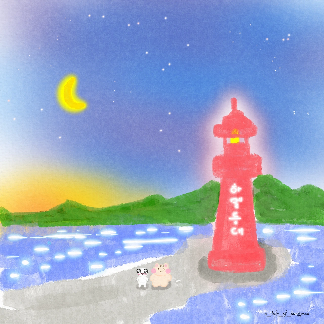 그냥이랑 인쭈랑(그냥 : 큰 아이가 내게 선물한 고양이 캐릭터 / 인쭈 : 작은 아이가 만든 어릴 적 캐릭터) 하멜 등대그림으로 추억을 남겨보아요. 동백꽃은 며칠 전 한파로 피다 말아서 좀 아쉽습니다.