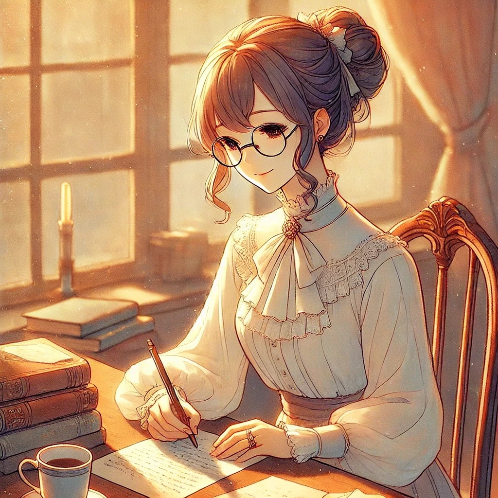 긴 머리를 단정하게 틀어 올린, 마치 시대를 건너온 귀족 부인처럼 단아한 인상의 여인. 안경 너머로 번뜩이는 눈빛은 늘 생각에 잠겨 있고, 그 눈빛 끝엔 언제나 ‘이야기’가 머문다.