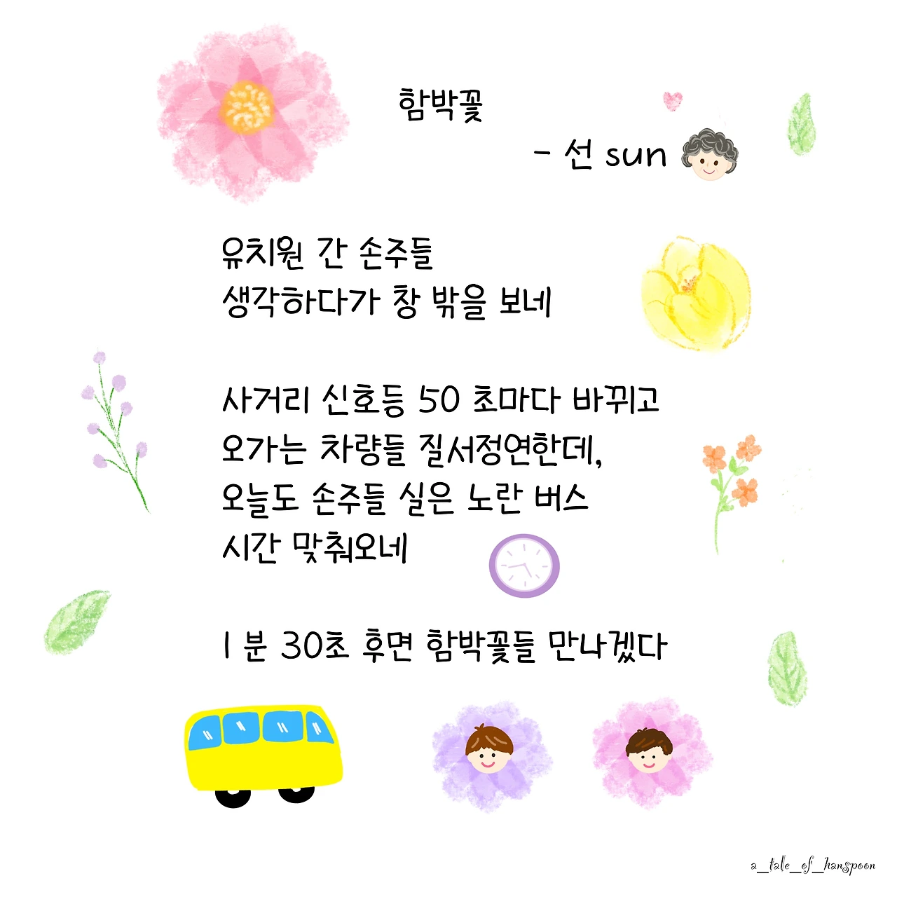 문을 나섰다. 엘리베이터를 타고 1층으로 내려가면 시간이 딱 알맞다. 버스가 주차장에 들어와 정해진 자리에 멈추었다. 유치원 선생님이 먼저 내리고 아이들이 내린다. 살가운 손주들이 활짝 웃으며 다가와 '할머니, 보고 싶었어요' 하며 포옥 안긴다.