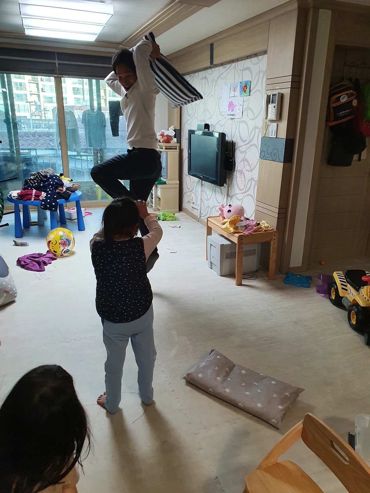 "웃어? 감히? 나의 코로나 블루 앤드 육아 스트레스를 너에게 날려주마! 받아라 첫째야 아촤~!!"