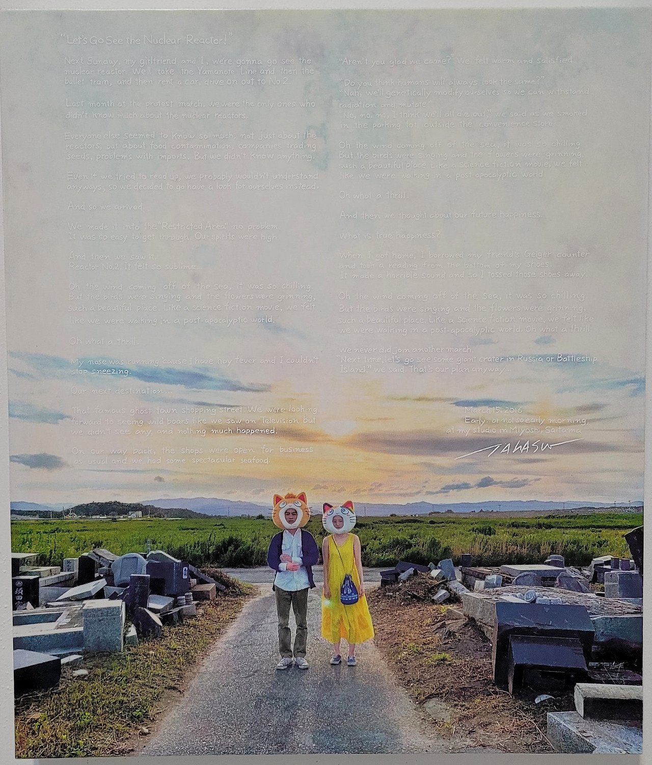 며칠 전 부산시립미술관에 ‘무라카미 다카시: 무라카미좀비’ 전시에 다녀왔다. 출구에 배치된, 맨 마지막 작품이 머리를 때리듯 가장 인상에 남았다. 일본 특유의 '애니메이션' 감성으로 원전 문제를 건드린 <원전을 보러 갈 거야>라는 작품. 사진 속 남녀는 테마파크나 동물원에서 인증샷을 남기는 커플처럼 원전을 배경으로 우스꽝스러운 탈을 쓰고 있다.