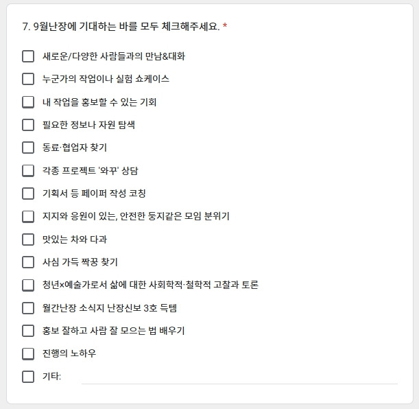 "당신은 누구신가요? 누구의 초대로 오시나요?" "아티스트라면 어떤 작업을 하시나요? '나는 아티스트가 아니에요'라고 한다면, 어떤 예술을 좋아하시나요?" "요즘 당신의 관심사는 무엇인가요?" "요즘 고민이나 어려움이 있나요? 함께 얘기 나누다 보면 도움이 될지도 몰라요." "9월 난장에 기대하는 바를 모두 체크해주세요." ...