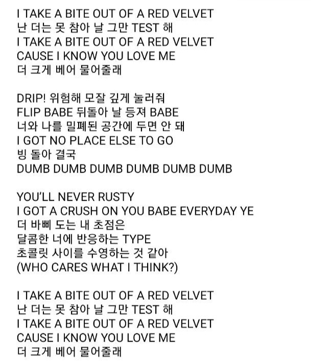 그리고 두 번째. "이 노래는 밝은 에너지를 표현하려 했던 곡이었으나". 라비의 의도가 뭐였는지는 하나도 중요하지 않다. 그리고 솔직히, 밝은 에너지를 표현할 수 있는 1235923917948개의 방법이 있는데 왜 하필 레드벨벳이라는 실존하는 그룹의 이름, 곡명, 멤버 이름까지 써먹나? 그것도 연인 간의 애정행위를 표현함에 있어서.