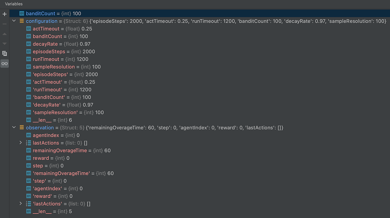 에이전트의 인자 값으로 observation과 configuration은 아래와 같이 대회 초기 설정값들로 설정되어있습니다. episodeSteps=2000으로 최대 레버를 당기는 횟수, reward(=보상) 1, 0으로 리턴됩니다. 해당 값은 계속 누적되게 되어있어 코드에서 차이를 계산하여 보상을 리턴해야 합니다. 그 외 decayRate = 0.97로 설정된 부분을 확인할 수 있습니다.