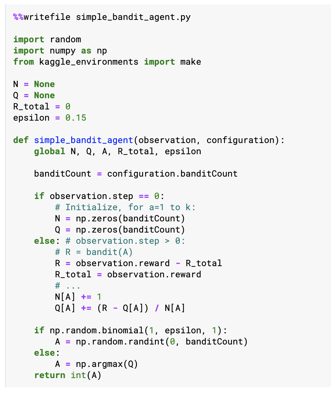 전체 코드는 "Santa 2020 - beginner (/w a simple bandit)" 또는 github에서 확인 가능합니다.