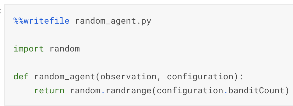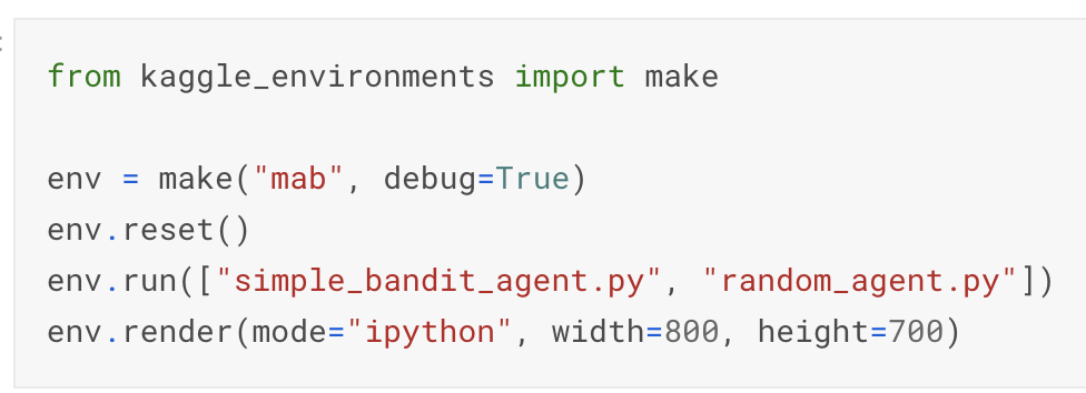 강화학습 환경인 kaggle_environments를 import 후 mab 환경을 생성합니다. 환경을 초기화해주고 env.run을 통해 생성한 Agent를 실행하여 경쟁하도록 합니다. 에이전트들은 파일로 만들어 아래와 같이 env.run의 인자로 넣어주도록 되어있습니다.