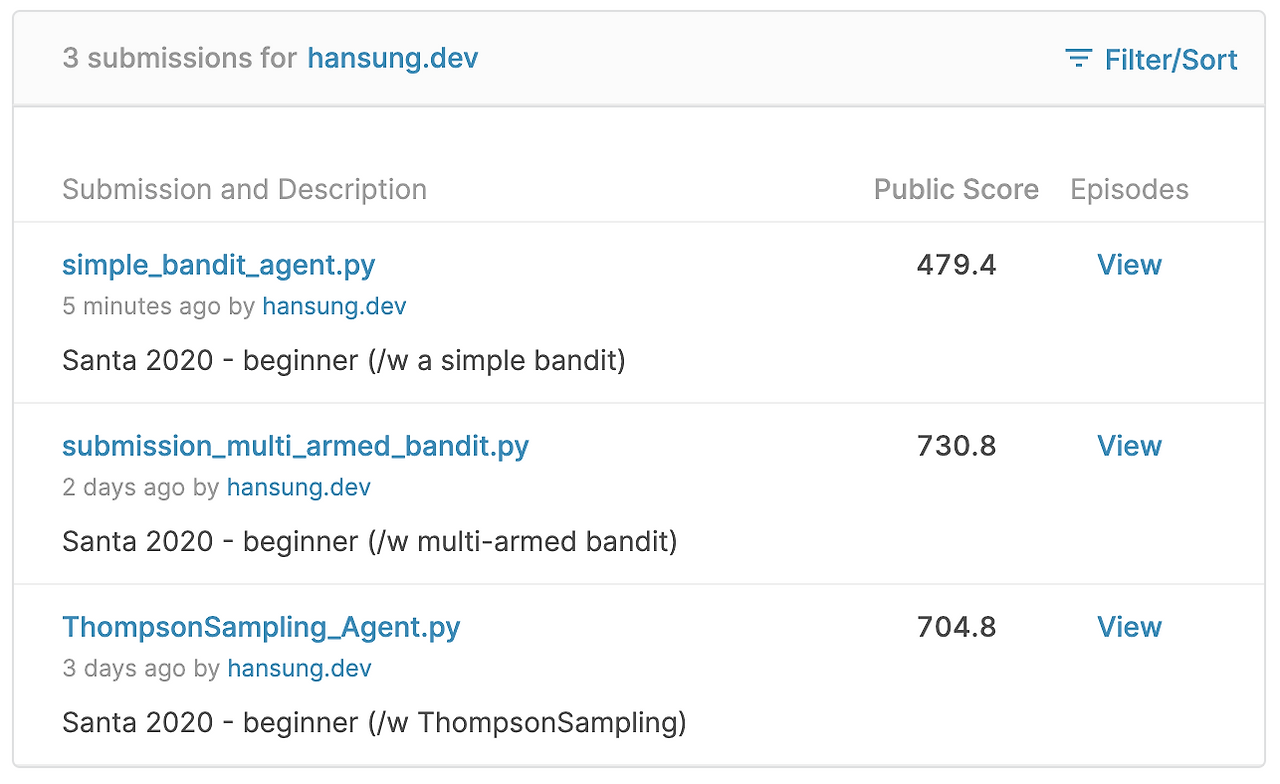 multi-armed bandit 문제를 단순화하여 a simple bandit 알고리즘으로 산타 대회 결과를 제출해보았습니다. 성능이 좋은 알고리즘을 단계적으로 적용하여 대회 상위권에 도전해보도록 하겠습니다.
