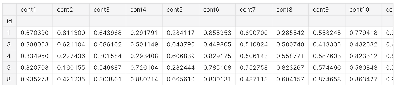 학습 데이터(=train/test)의 컬럼을 살펴보니 id, cont1~14, target까지로 구성된 부분을 확인했습니다. 컬럼(=피처)들은 모두 비식별화되어있네요.
