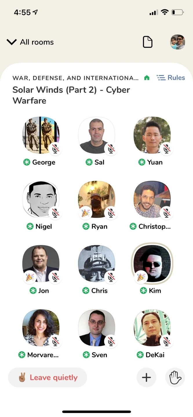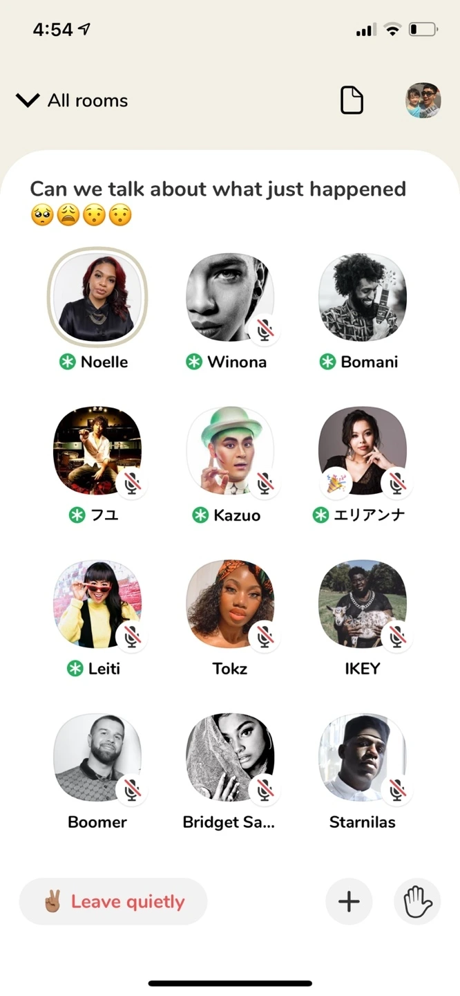 방을 클릭하면 입장하고 "Leave quietly"를 누르면 방을 나갑니다. 방 입장을 하면 서로 얘기하는 음성이 들립니다. 프로필이름 옆 녹색 별 모양이 Moderator(=진행자)입니다. 프로필 사진 왼쪽 하단에 폭죽은 시작하고 7일 동안 보인다고 하네요. 뉴비라는 뜻입니다. 클럽하우스 문화 중 뉴바를 축하해주는 문화기 있으니 폭죽모양을 보시면 환영해주세요. 하단 오른쪽의 손 모양이 손들기 기능입니다. +를 눌러 다른 방의 팔로워 한 친구를 초대도 할 수 있습니다. 스피커가 되어 말하지 않을 때는 음소거 여부를 선택할 수 있습니다.