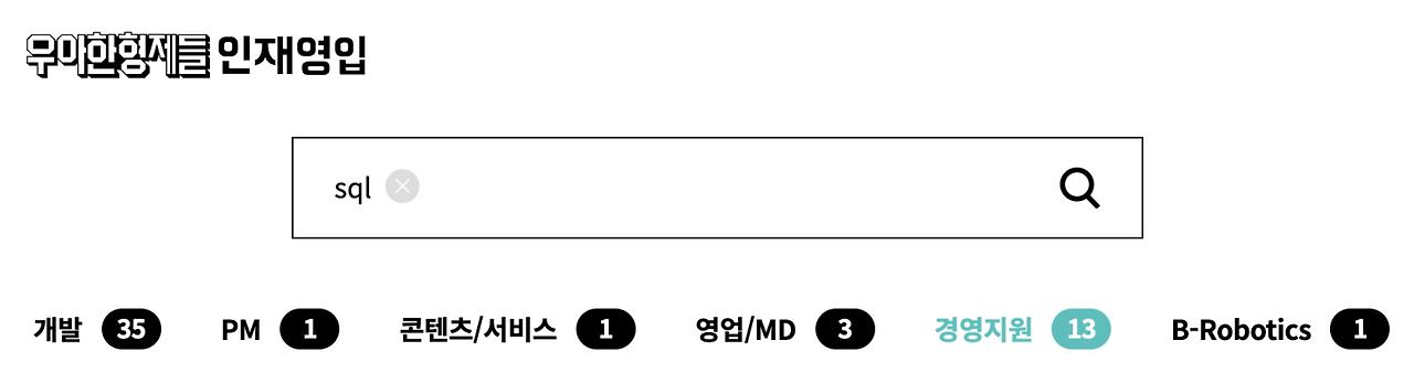 우아한 형제들 인재영입 사이트에서 sql로 채용 공고를 검색해보면 개발외에도 다양한 직무에서 sql 사용 능력을 요구하고 있습니다. 개발 35건, 경영지원 13건, PM 1건, 콘텐츠/서비스 1건, 영업/MD 1건, B-Robotics 1건으로 확인됩니다.