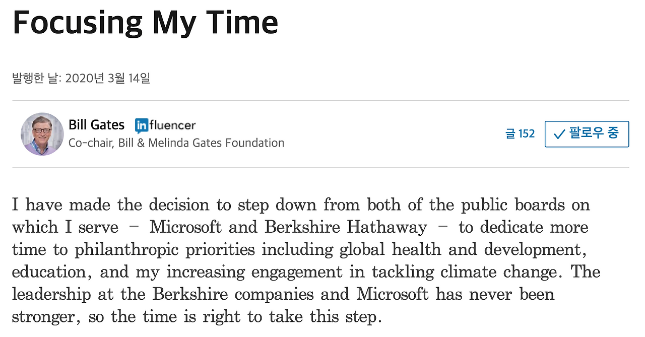 그러다 최근 친구의 추천으로 <인사이드 빌 게이츠>를 보게 되었다. 빌 게이츠는 최근 마이크로소프트와 버크셔 해서웨이 이사직 사임을 선언했다. 여전히 그에게 MS는 중요한 존재이지만 세상의 어려운 일들을 해결하는 일에 더 집중하고 싶다는 것이었다.
