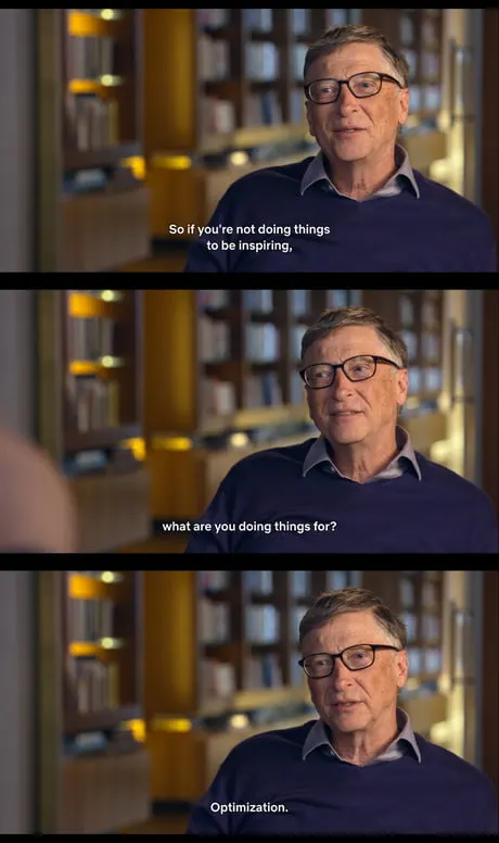 그렇지만 다큐멘터리를 보고 생각이 완전히 달라졌다. 이성을 무기로 사회를 혁신하고자 하는 사람이었다. 무신론자인 내게 객관적인 데이터와 이성은 내가 믿는 유일한 개념이고, 그래서 나는 빌 게이츠에게 즉시 매료되었다.