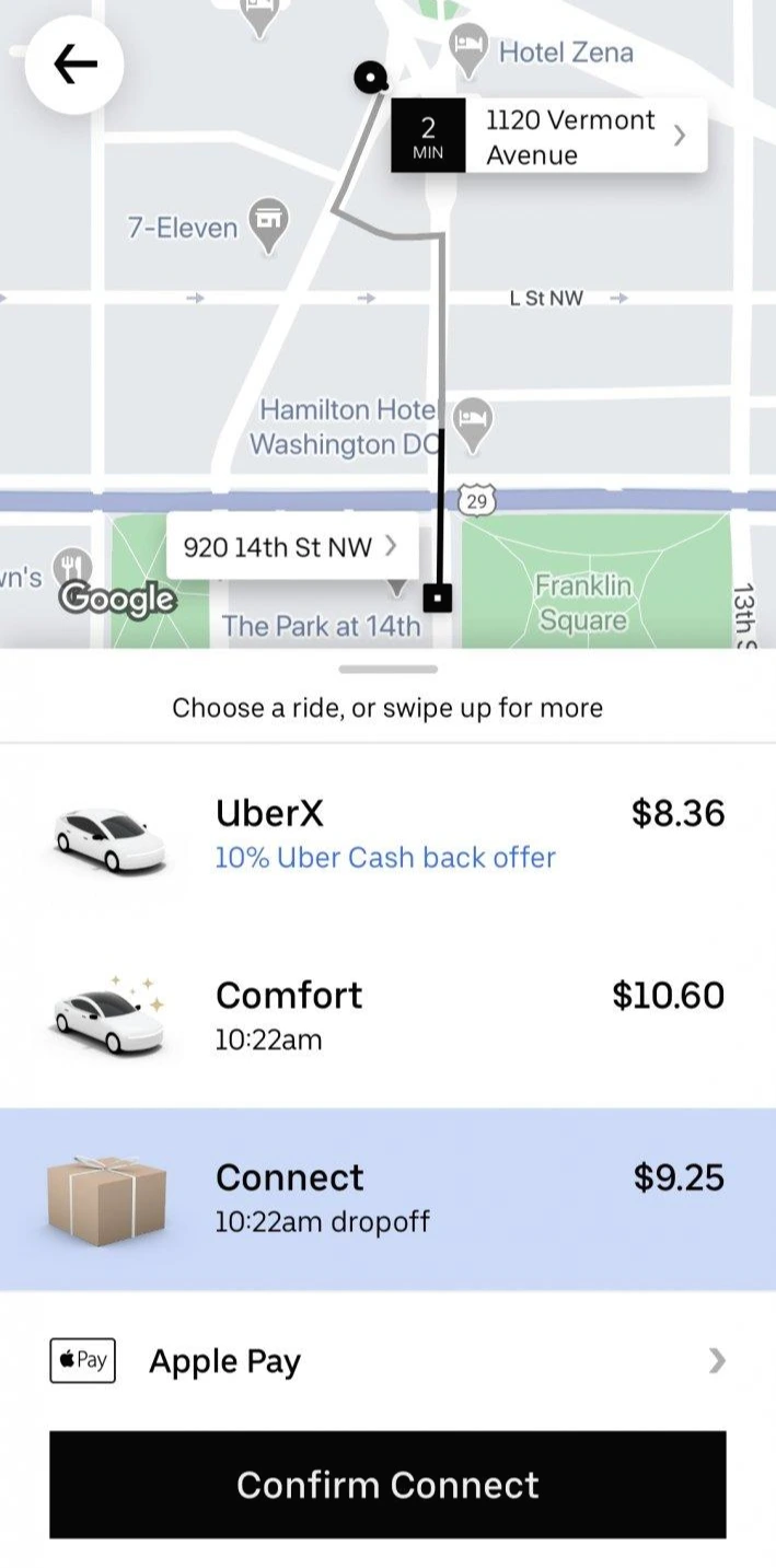 우버도 리프트처럼 배송 서비스를 시작한다. 바로 지난 4월, 우버 커넥트(Uber Connect)라는 고객 간 물품 배송 C2C 서비스와 물품 예약 배달 서비스인 B2C 개념의 우버 다이렉트(Uber Direct)를 론칭한 것이다. 우버 다이렉트는 2016년에 시도했던 서비스인 우버 러시(Uber Rush)의 후속작으로, 2018년 시비스 종료 이후 코로나19의 흐름에 재런칭하게 된 것이다.