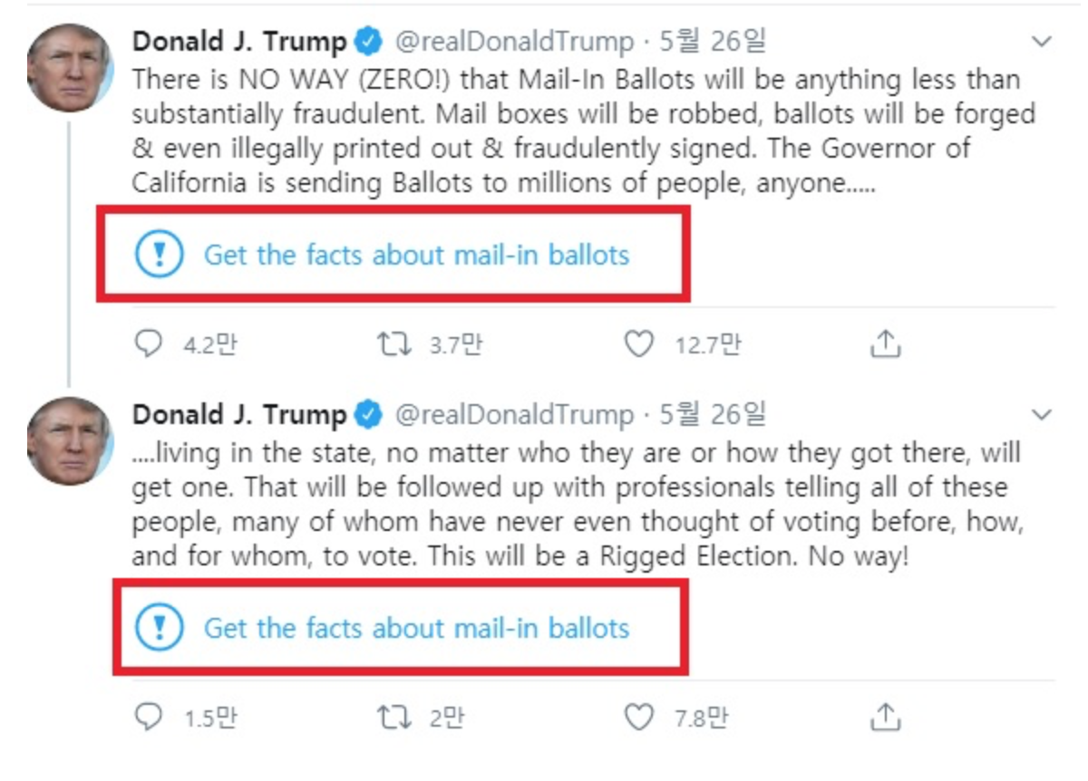 이 일은 민주당 소속의 캘리포니아 주지사 게빈 뉴섬이 우편 투표를 실시하겠다고 한 데에서 출발한다. 트럼프 대통령이 우편 투표가 부정선거로 이어질 수 있다는 트윗으로 반발하자, 트위터 측에서 우편 투표에 대한 사실을 확인하라는 경고문을 밑에 단 것. 이에 화가 난 트럼프가 강경 대응에 나선 것이다.