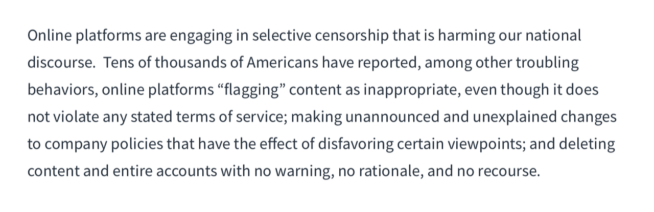 이제 소셜미디어에 거짓이거나 명예를 훼손하는 게시물을 올라오는 경우, 이에 대한 검열을 더욱 강화해야 한다. 그간 SNS 기업들은 통신품위법(Communication Decency Action) 230조에 따라 어떤 내용의 게시물이 올라와도 법적 제재를 받지 않았다.