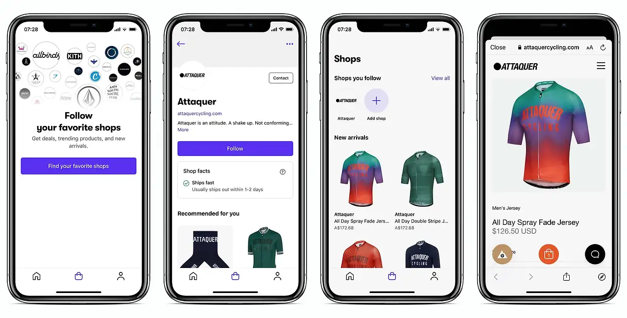 쇼피파이는 최근 숍(Shop)이라는 앱을 출시했다. 쇼피파이 솔루션을 사용하는 앱들이 입점할 수 있는 서비스인데, 지그재그 느낌을 생각하면 좀 와닿을 것 같다. 그렇지만 광고비나 플랫폼 입점료를 전혀 받지 않고 있다. 유사한 상품을 추천해준다는 점에서는 핀터레스트와 유사하고, 근처에 있는 브랜드를 추천해준다는 점에서는 당근마켓이랑도 유사하다. 코로나로 인해 출시 시기를 앞당겼다고. 페이스북이 최근 출시한 페이스북 샵과 손잡기도 했다.