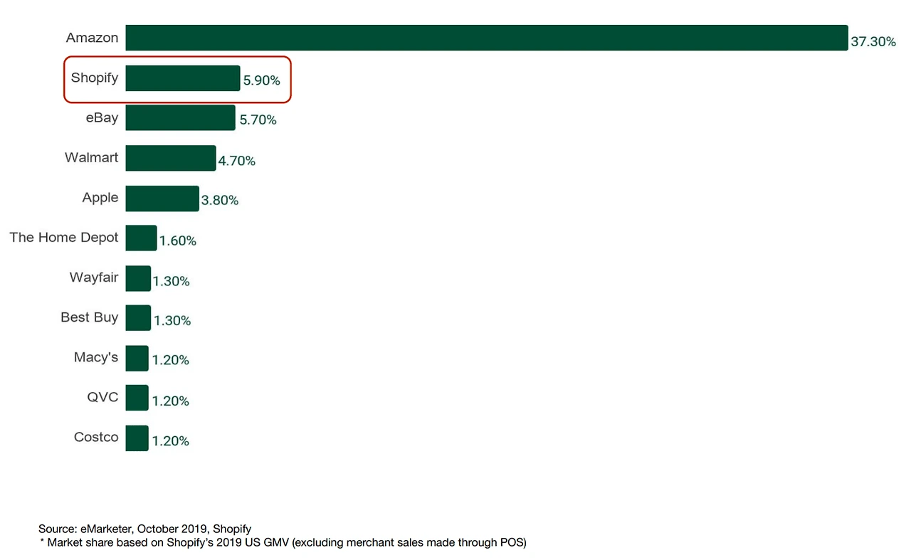 캐나다 증시 1위 기업이기도 한 쇼피파이는 현재 미국 전자상거래 기업 순위에서 이베이를 제치고 2위에 올랐다. 약 60만 명의 판매자가 가입되어 있고, 친환경 신발 브랜드로 최근 한국에도 상륙한 올버즈, 인스타그램 팔로워 1.9억 명에 빛나는 대표 인플루언서 카일리 제너의 카일리 코즈메틱 역시 쇼피파이의 고객이다. 쇼피파이는 마케팅과 판매 등을 아우르는 서비스를 제공 중인데, 특히 스트라이프와 손잡고 출시한 쇼피파이 페이먼트라는 자체 결제 시스템은 결제 수수료만 있고 거래 수수료는 없어 각광받는 중이다.