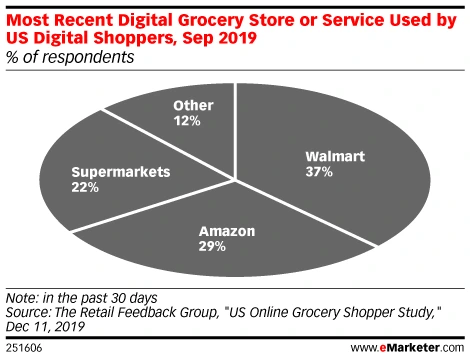 그 외에도 월마트는 본인의 강점인 신선식품과 많은 매장 수를 잘 살리고 있다. 미국 인구의 90%가 월마트에서 10마일(약 16km) 내에 살고 있다고 한다. 이런 많은 매장 수와 쉬운 접근성을 활용할 수 있는 섹터야말로 신선한 식료품. 아마존 역시 홀푸즈를 인수하고 아마존 고 등 신선식품을 구매할 수 있는 매장을 확장하고 있지만 빨리 상하기 쉬운 상품 특성상 소비자는 오프라인으로 사는 것을 더 편안하게 생각할 수밖에 없다. 코로나19 이후 월마트는 온라인으로 주문 후 오프라인으로 구매하는 클릭 앤 컬렉트 (Click & Collect) 모델을 채택하고 있고, 픽업 스탠드 같은 서비스를 도입했다.