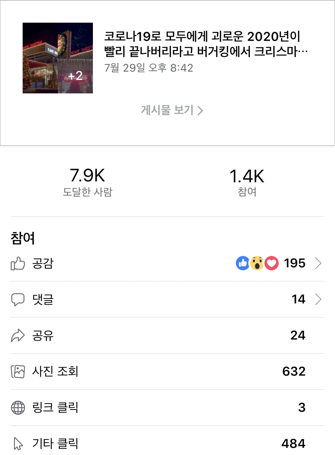 슬프지만, 당연한 얘기. 이미 구독자 수가 많은 채널에서 게시물을 공유해주거나 소개해주는 것이 가장 반응이 빠르다. 나의 경우, 전에 올렸던 버거킹의 크리스마스 마케팅 사례를 일간 마케팅에서 공유해주셨다. 덕분에 하루만에 도달 7k를 찍으며 좋아요를 단숨에 100개 넘게 받을 수 있었다.