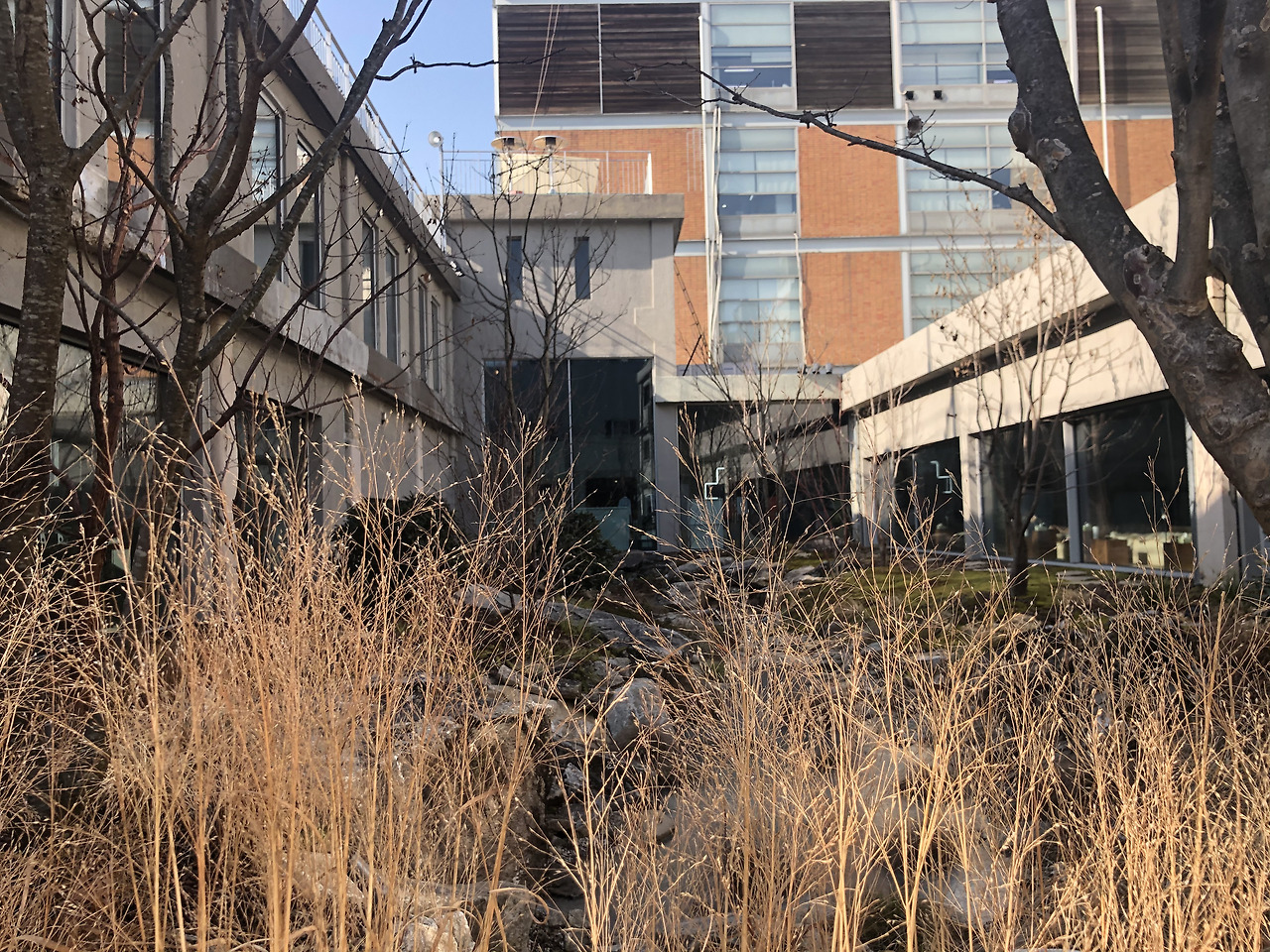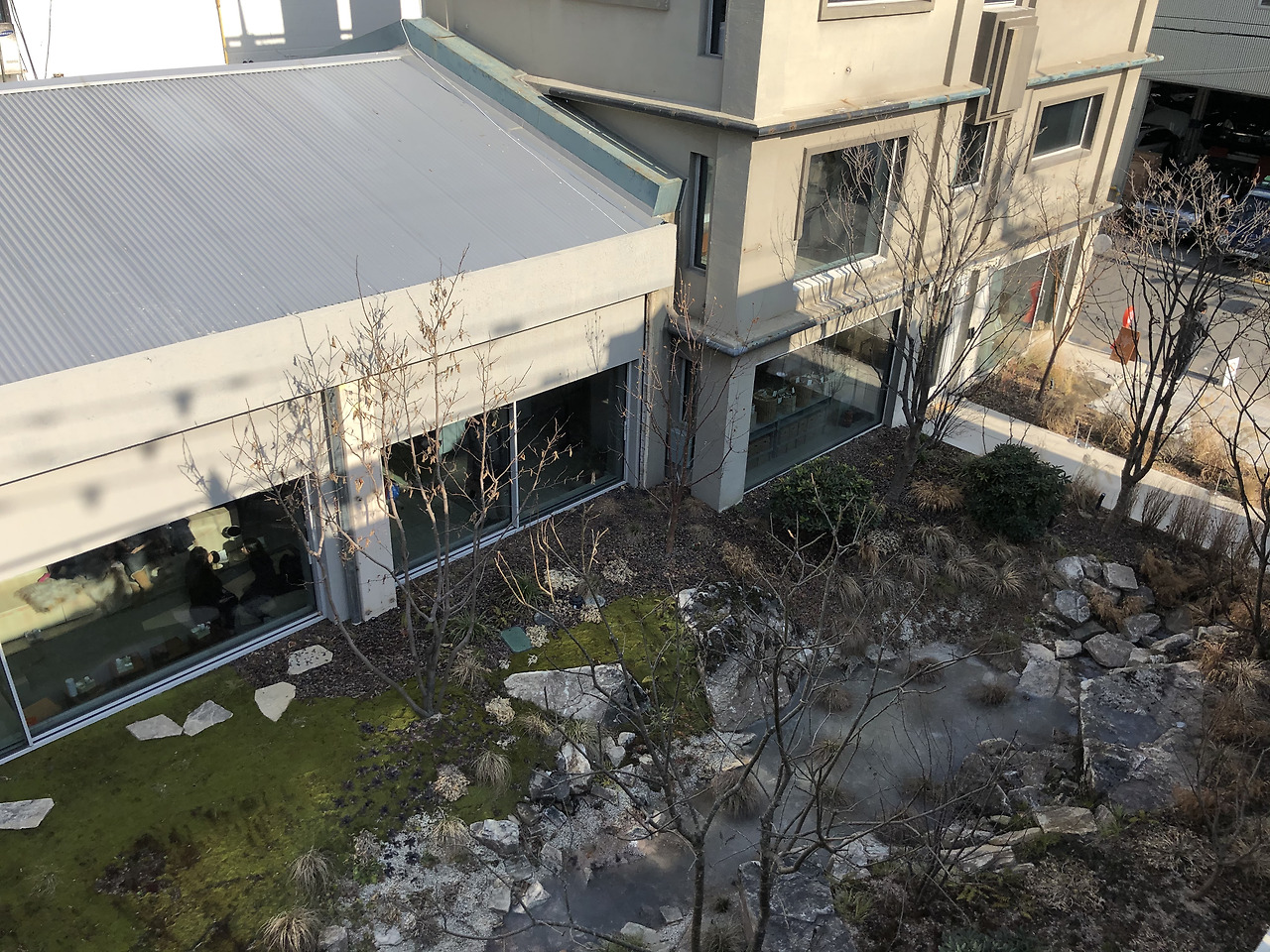 아모레성수에서 핵심 공간 중 하나는 ㄷ자 가운데에 자리잡은 성수가든이다. 초기 기획 단계부터 있던 공간이라는데, 이렇게 중앙을 중심으로 실내 공간이 동심원을 이루는 구조는 고대 로마에서 호르투스 콩클루수스hortus conclusus라 불렸다고 한다. (출처 : 월간디자인 http://mdesign.designhouse.co.kr/article/article_view/101/80467) 음지식물인 고사리, 이끼와 나무, 갈대 등이 함께 어우러져 있는 공간으로, 날이 추워 얼어 있었지만 가운데에는 연못도 자리잡고 있었다. 아모레성수 내부 공간은 창이 아주 넓어 햇빛이 잘 들어오고, 성수가든의 뷰가 한눈에 들어온다. 공장스러운 내부 공간과 겨울에도 푸른 외부 정원의 모습이 묘하게 잘 어울린다.
