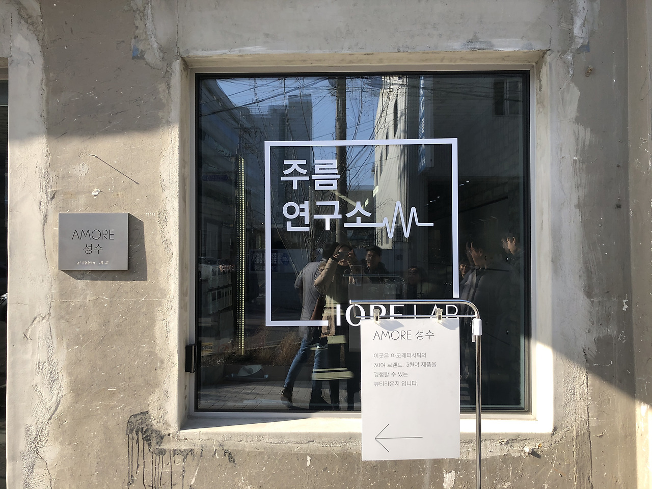 아모레 성수는 기존에 자동차 경비소였던 공간이었다고 한다. 그래서인지 정비소와 수제화 공장이 즐비한 날것의 성수 아이덴티티를 한껏 살렸다. 원래의 공간을 인더스트리얼한 인테리어로 승화시킨 건데, 콘크리트 모양의 건물을 ㄷ자로 디자인하고, 중간에는 정원을 구성하였다.